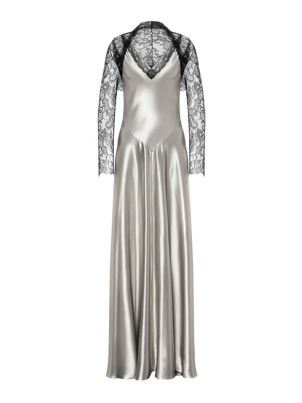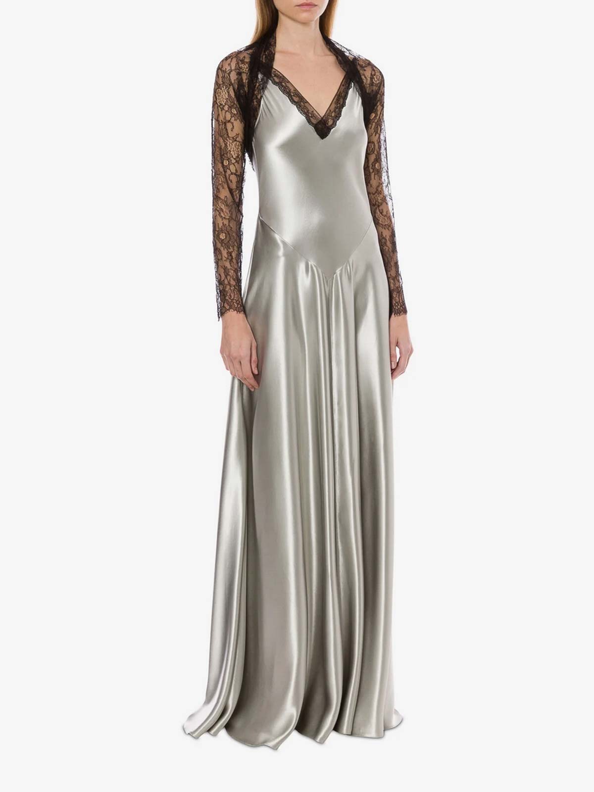 ブラックのアルバータフェレッティレースのインサートをあしらったサテンのロングドレス。流れるようなラインが体型を優しく包み込み、薄手のレーススリーブと刺繍ボーダーをあしらったVネックラインが洗練された魅惑的な雰囲気を演出します。スリムフィット。