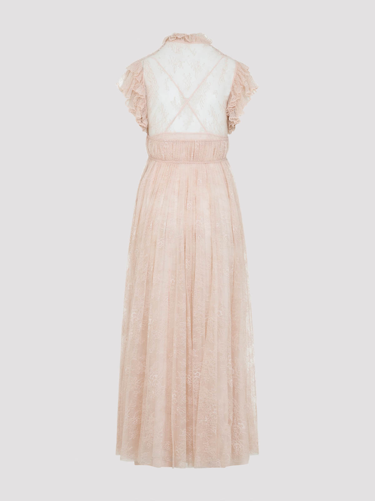 アルバータフェレッティベージュレースロングドレス。ピュアベージュのポリアミドドレス、マルチレイヤーデザイン、スタンドアップカラー、レース透明Vネック、オープン透明レースバック、ショートフリルスリーブ、ウエストゴムディテール、フレアスカート、足丈、ストレートヘム。全体に同系色の花レースデザイン、ベージュの裏地。