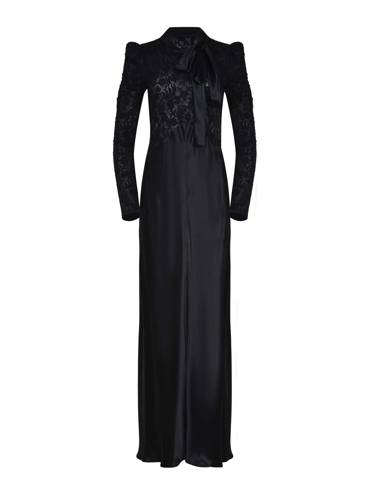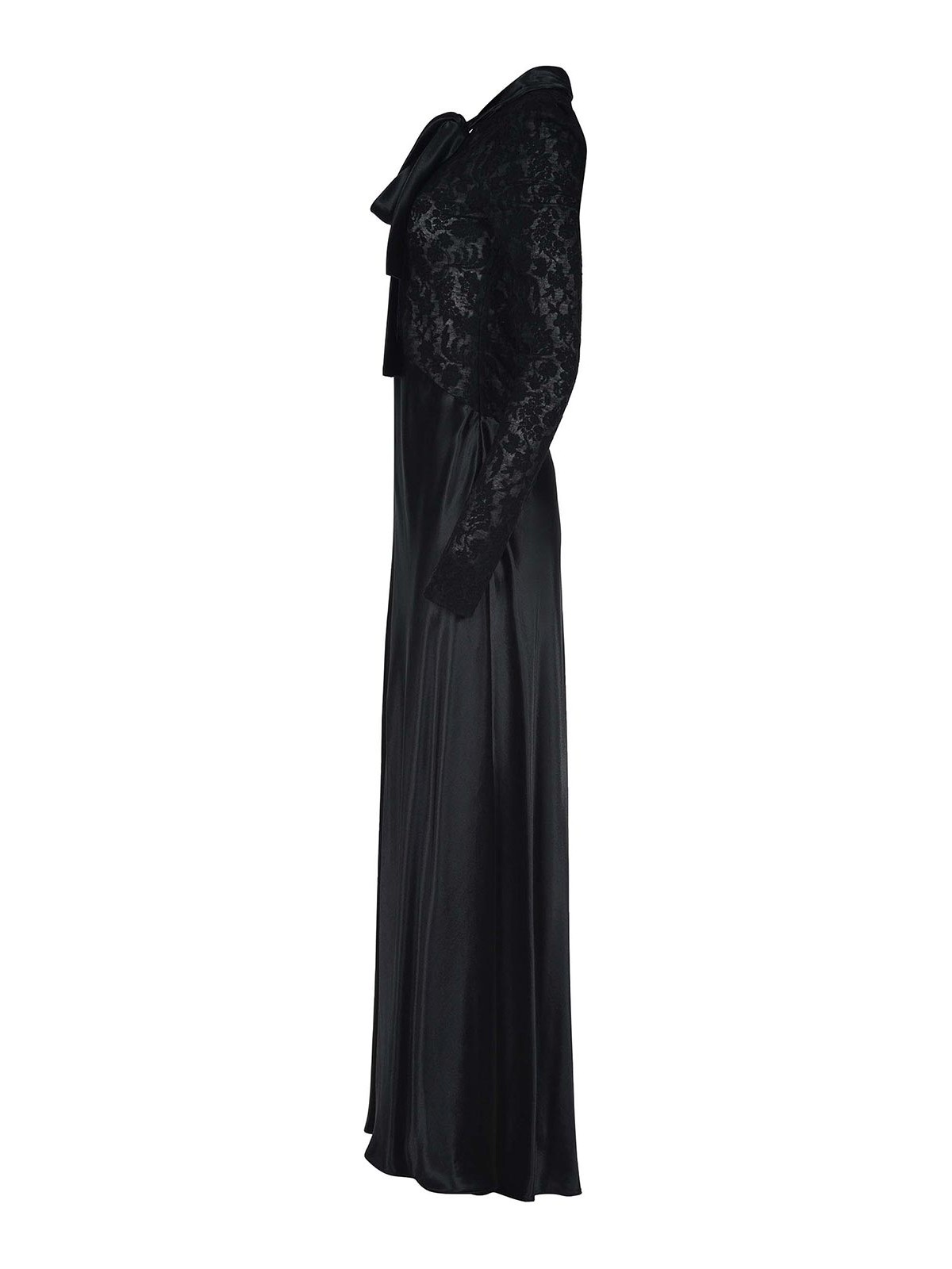 アルバータ・フェレッティ・ドレスはブラック・ビスコース製、襟元はスカーフで結び目までスカーフ、ボディス、ロングスリーブは全面レース製、100% ビスコース製イタリア製