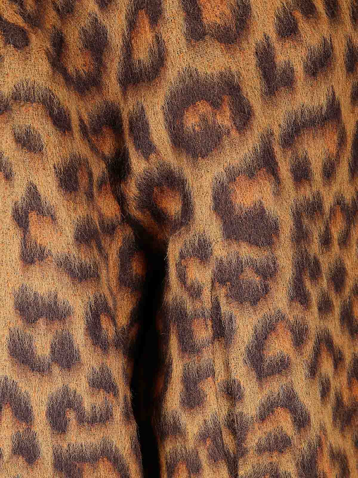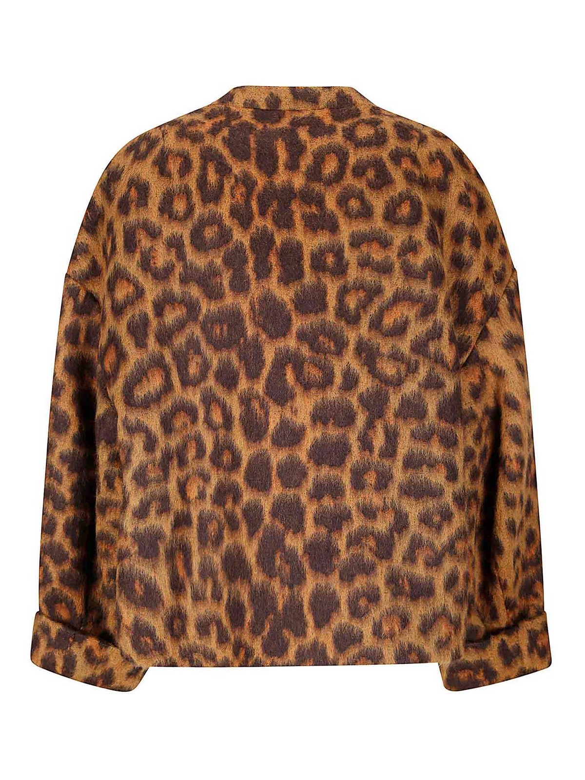 フロントボタン留め、2つのウェルトポケット、ヒョウ柄、クロップドデザインのノーカラージャケット。