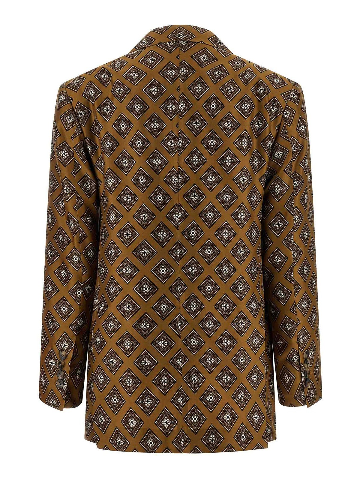 フロントホーンボタン留め付きダブルブレストシルクタイブレザー、ピークラペル、胸ポケット、フラップポケット、パッド入りショルダー、ロングスリーブ、バックベンツ、裏地なし。