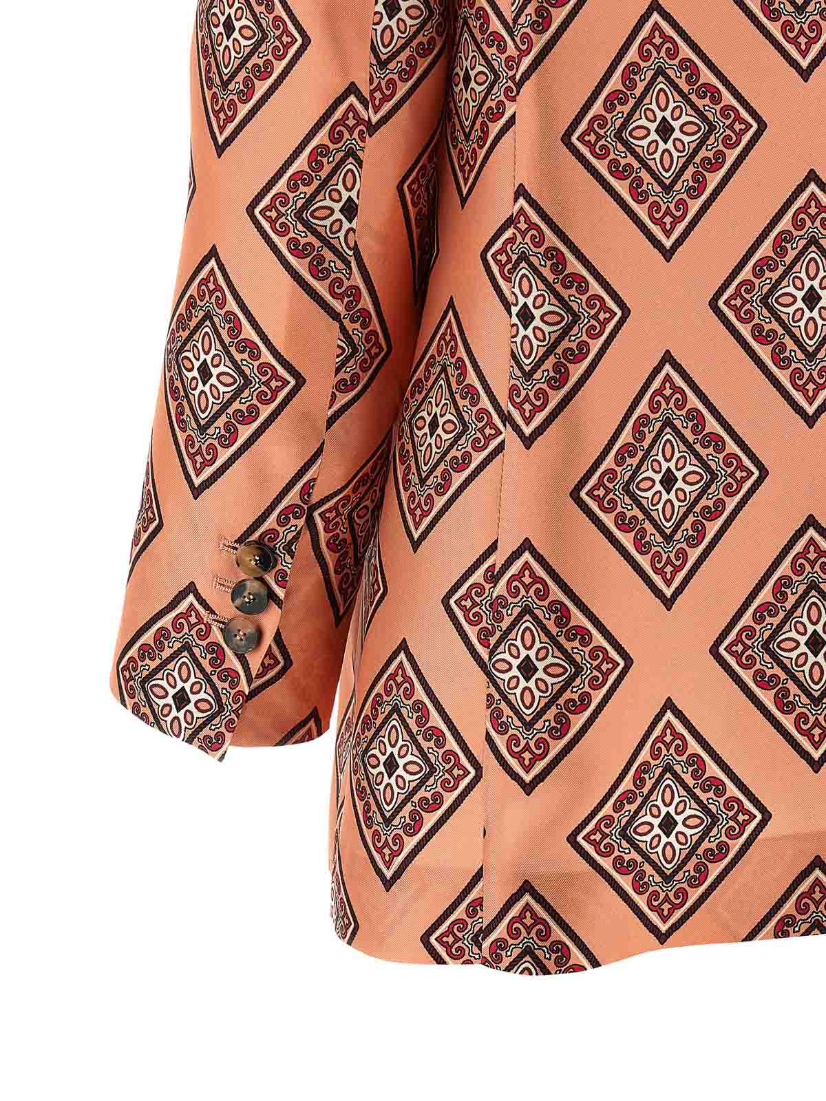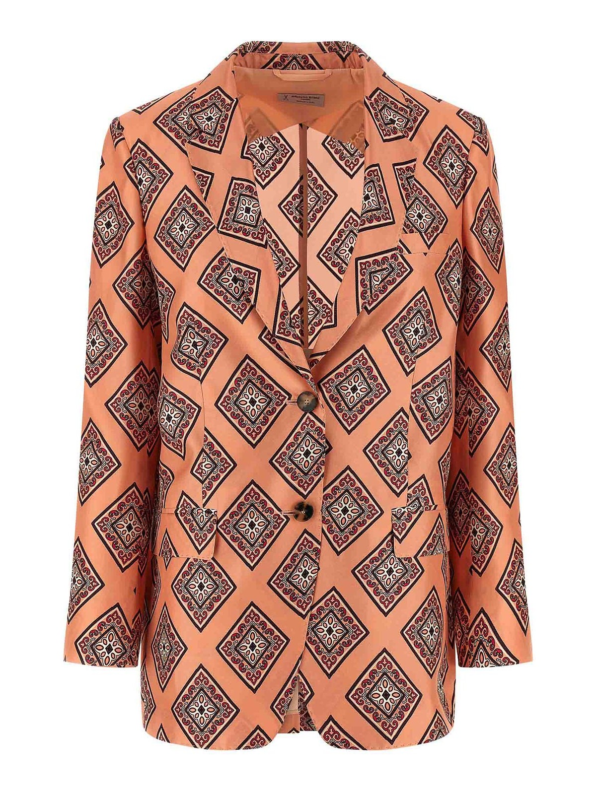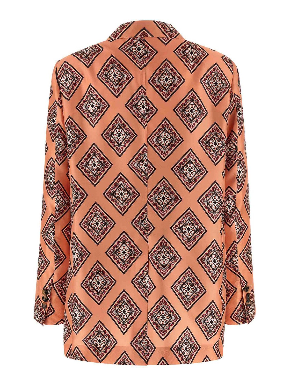 シングルブレストのシルクブレザー。フロントホーンボタン留め、ミラーラペル、胸ポケット、フラップポケット、パッド入りショルダー、ロングスリーブ、バックスプリット、裏地なし。