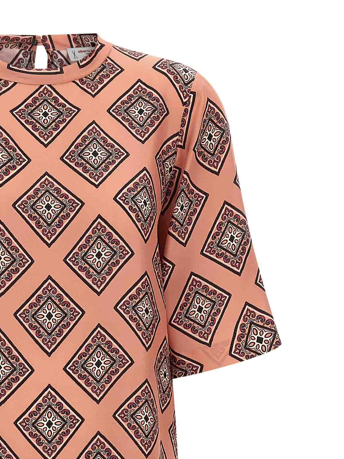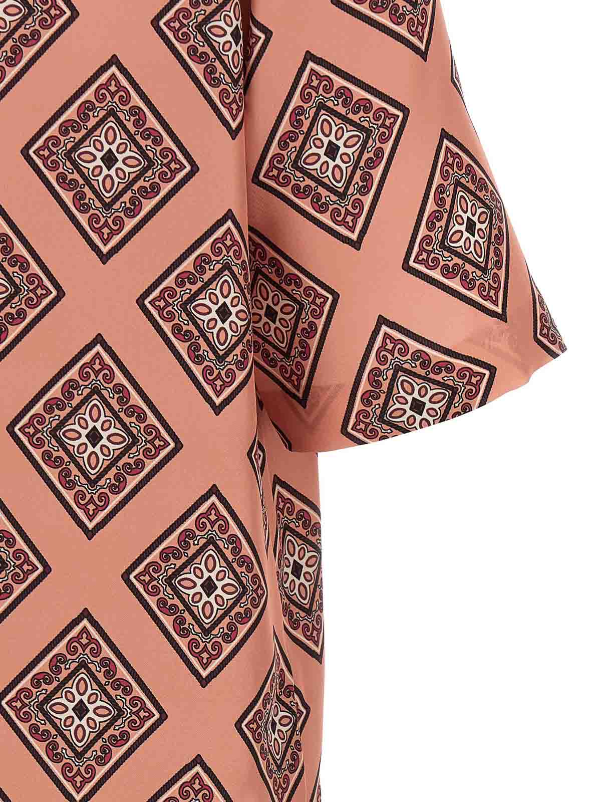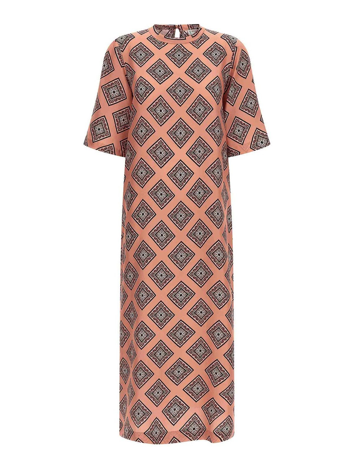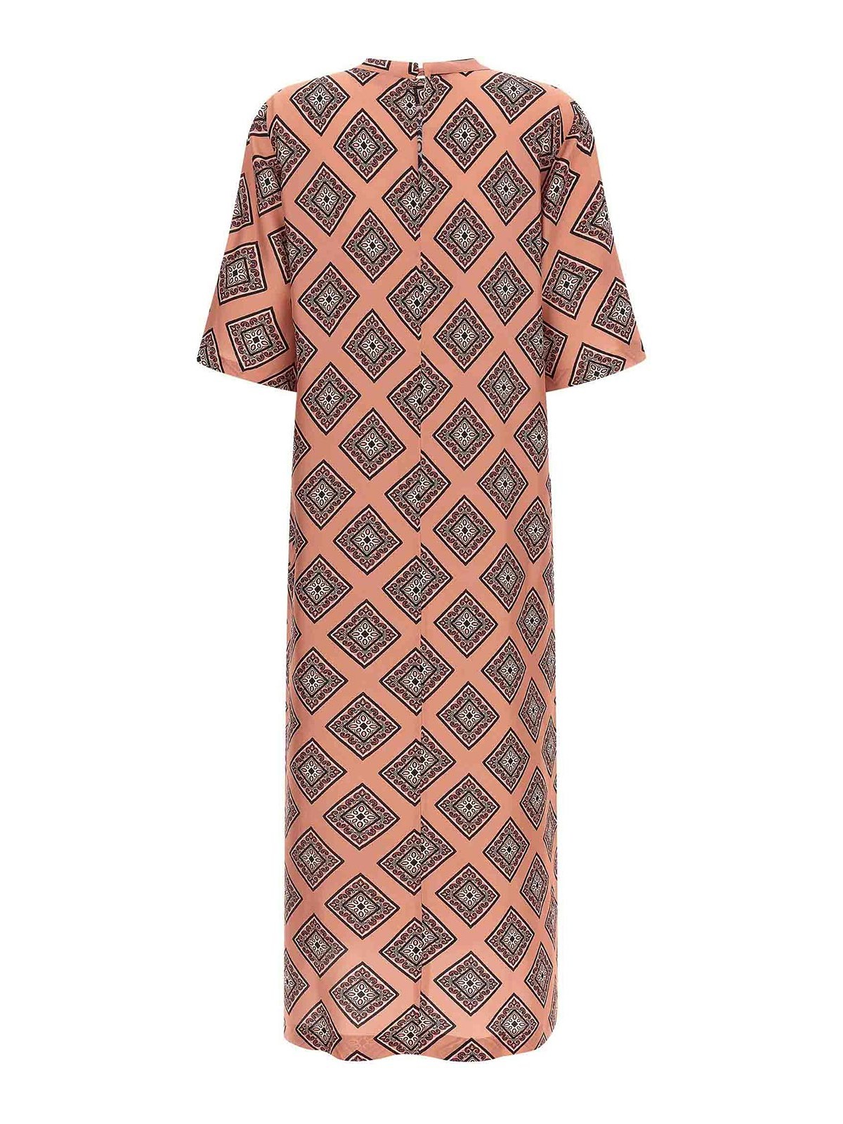 ネクタイプリントのシルクのロングドレス、カットアウトティアドロップのディテールが施されたバックボタン留めのクルーネック、ドロップショルダー、バックスプリット付きの幅広のショートスリーブ。