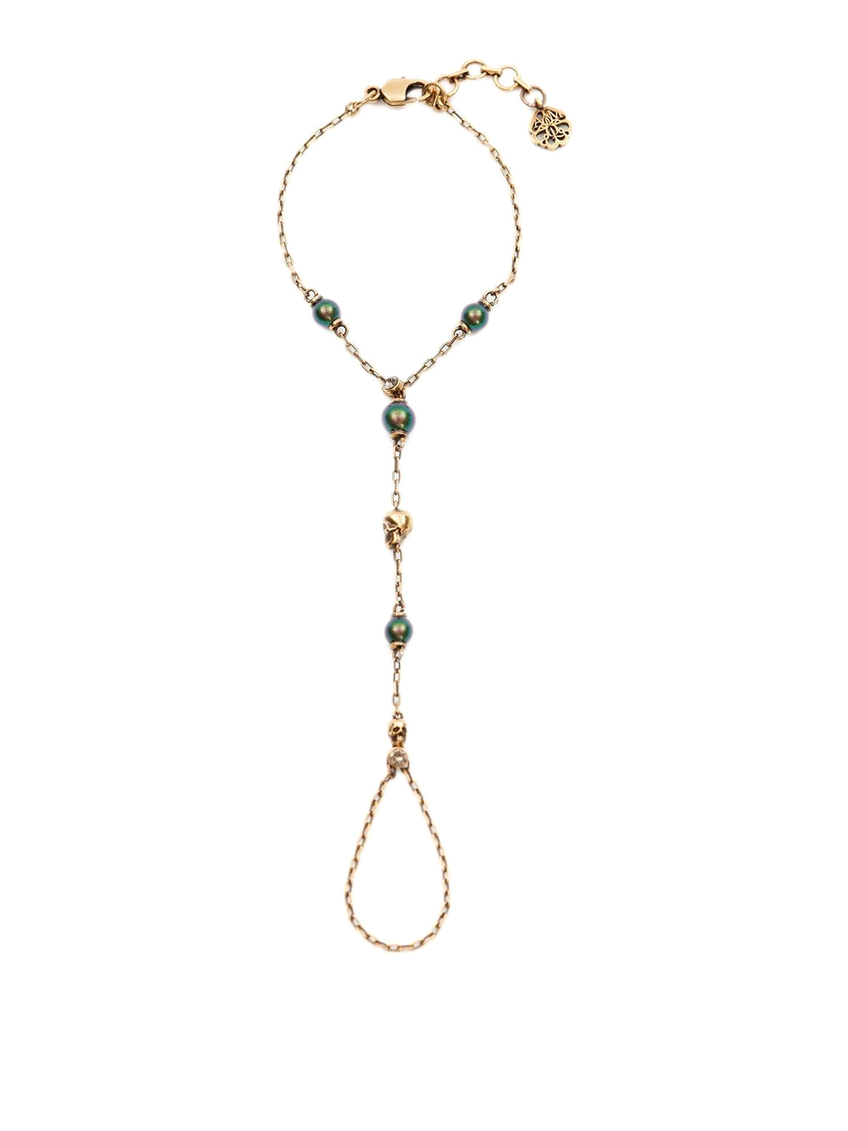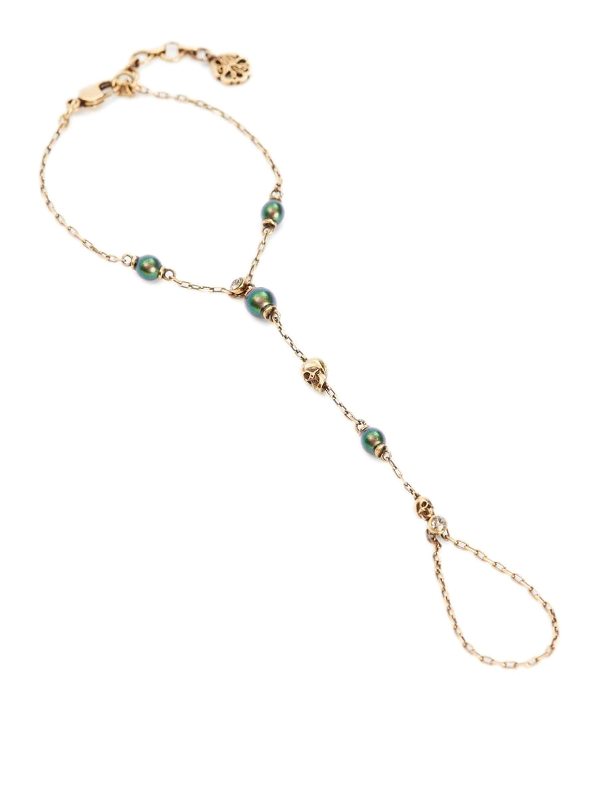 Alexander Mcqueenのスカルクリスタルブレスレット。ゴールドトーン、真鍮、スカルチャーム、スワロフスキークリスタル装飾、フェイクパール装飾、虹色効果、チェーンリンクディテール、ロブスタークロウ留めが特徴です。