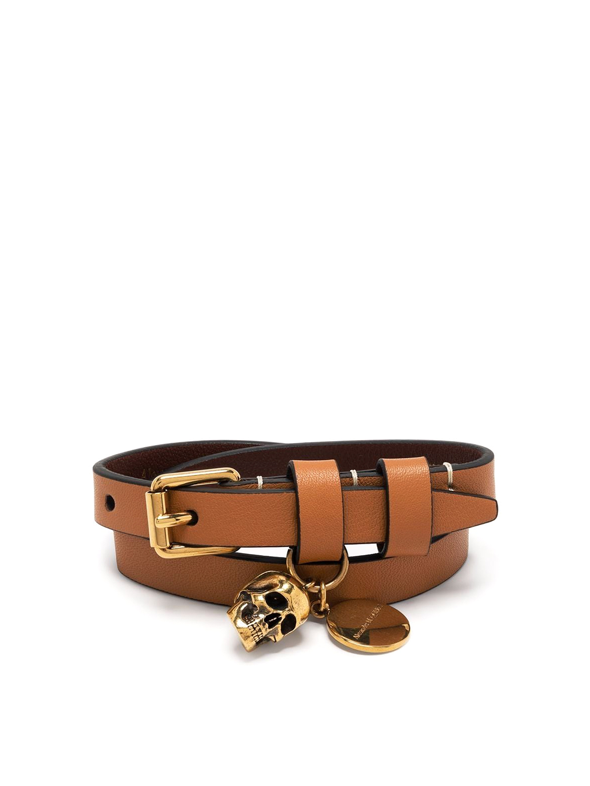 Alexander Mcqueenのスカルダブルラップブレスレットは、タンブラウンのカーフレザーのスカルチャームラップデザインとバックル留めが特徴です