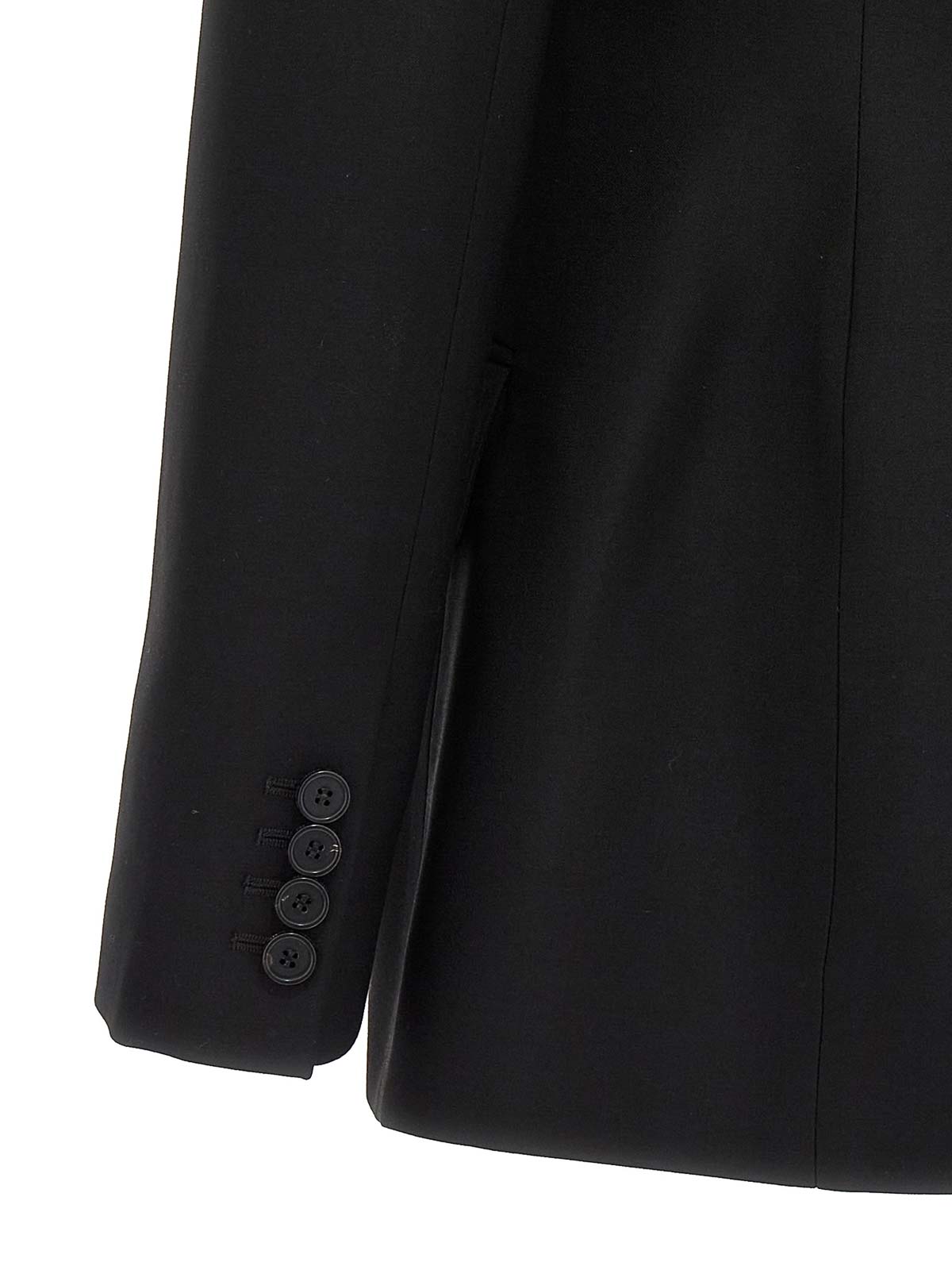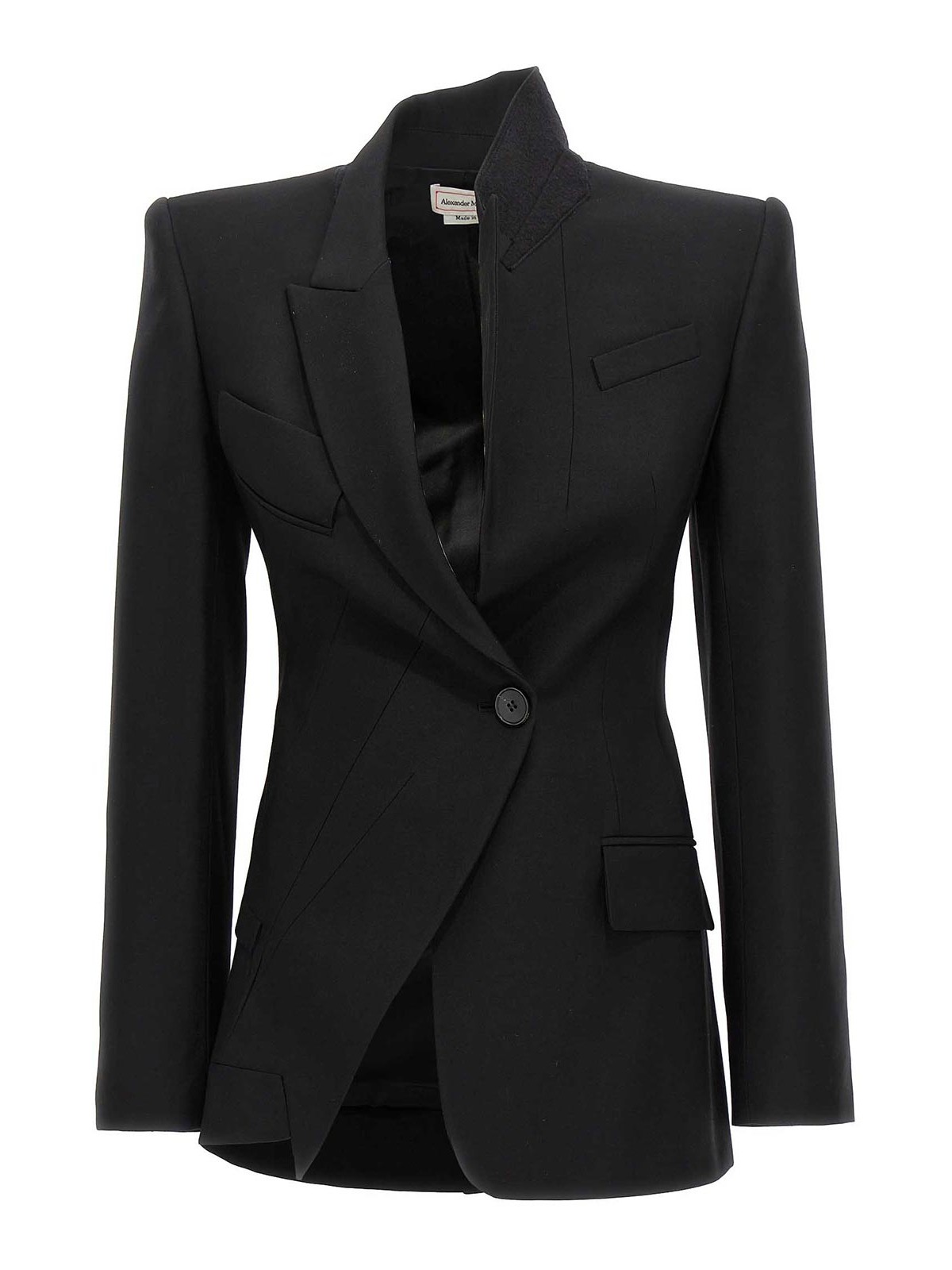 ボタンポケット、ストラクチャードショルダー、ロングスリーブが特徴のシングルブレストスタイルのアシンメトリーテーラードブレザージャケット