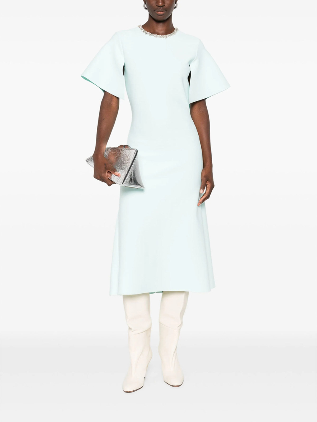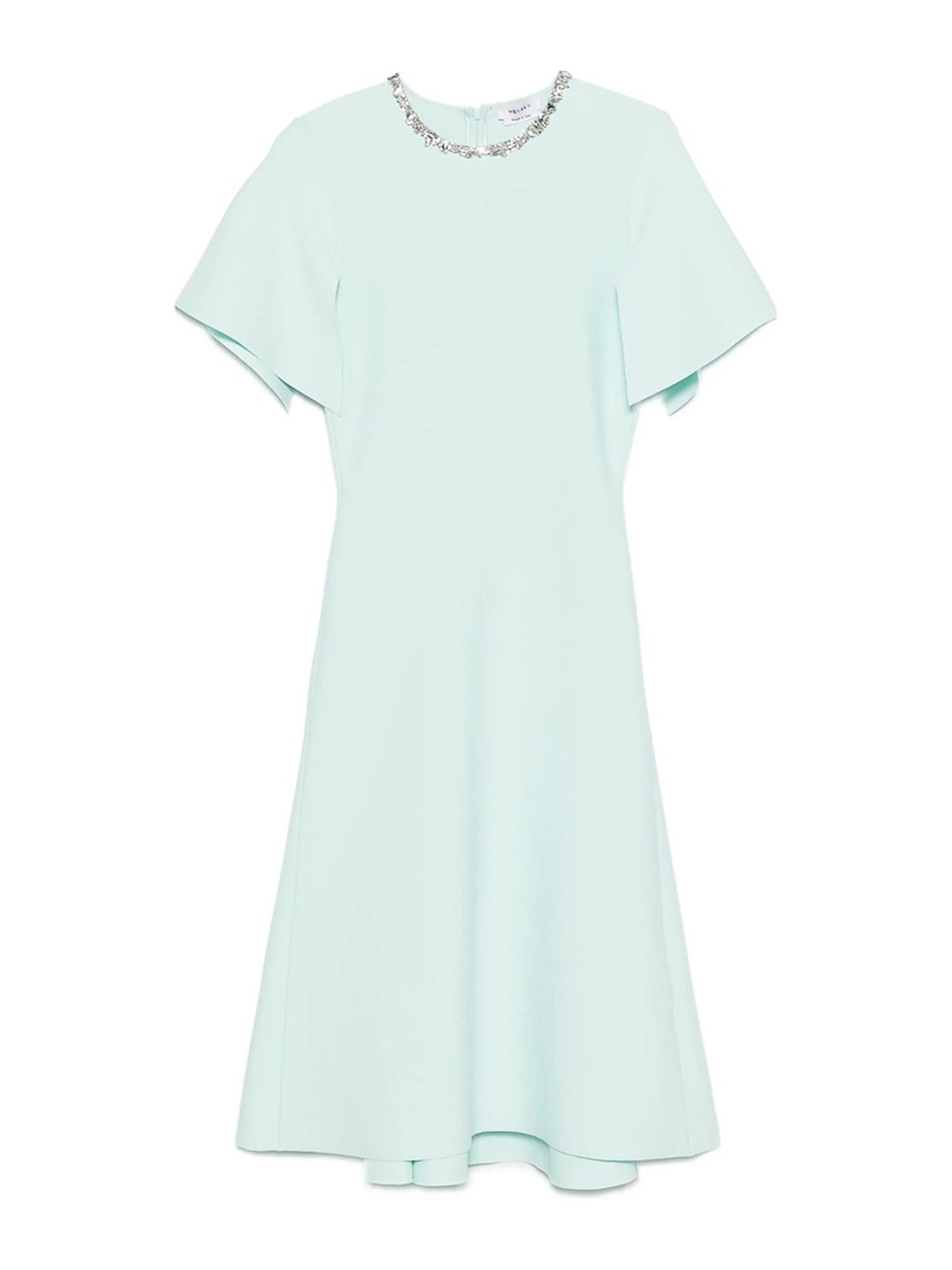 緑の装飾が施されたネックライン半袖A、ラインシェイプのフレアスカート