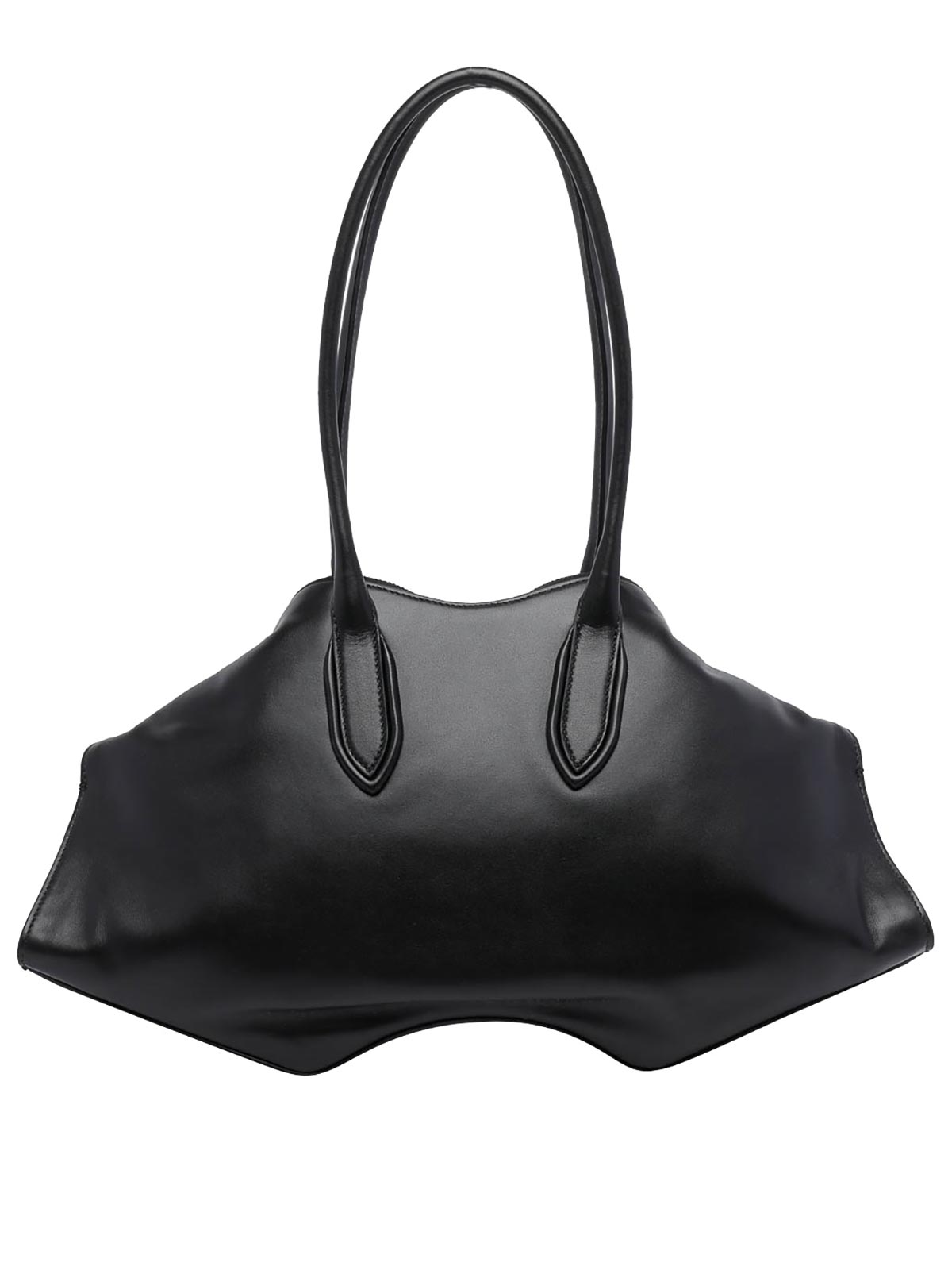 Mcqueen ブラックマンタショルダーバッグ、ファスナー開閉、内側にオープンポケット、ハンドル2つ、ロゴ