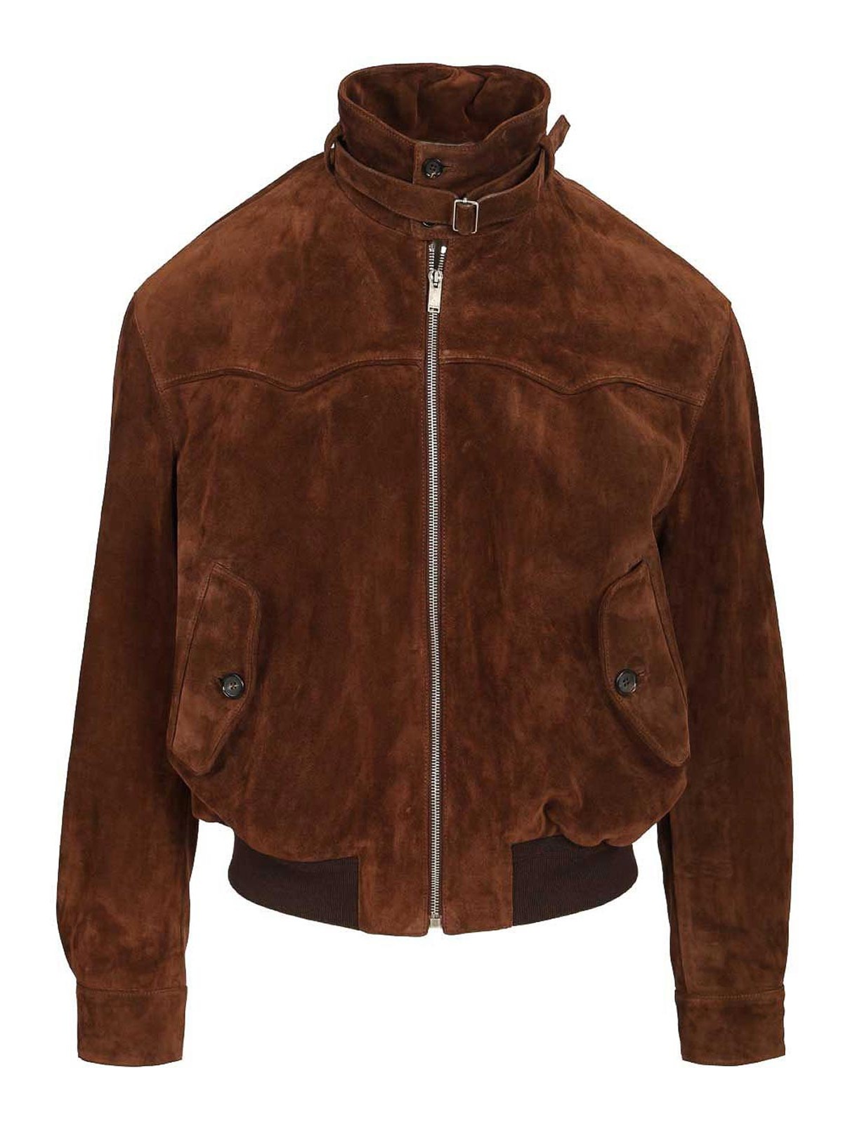 同系色のリブトリムをあしらったダークブラウンのスエードジャケット。ボタンとバックルストラップ付きのスタンドカラー、サイドフラップポケット、フロントジッパー付き。背面にはT字型のチェーンディテールが施されています。