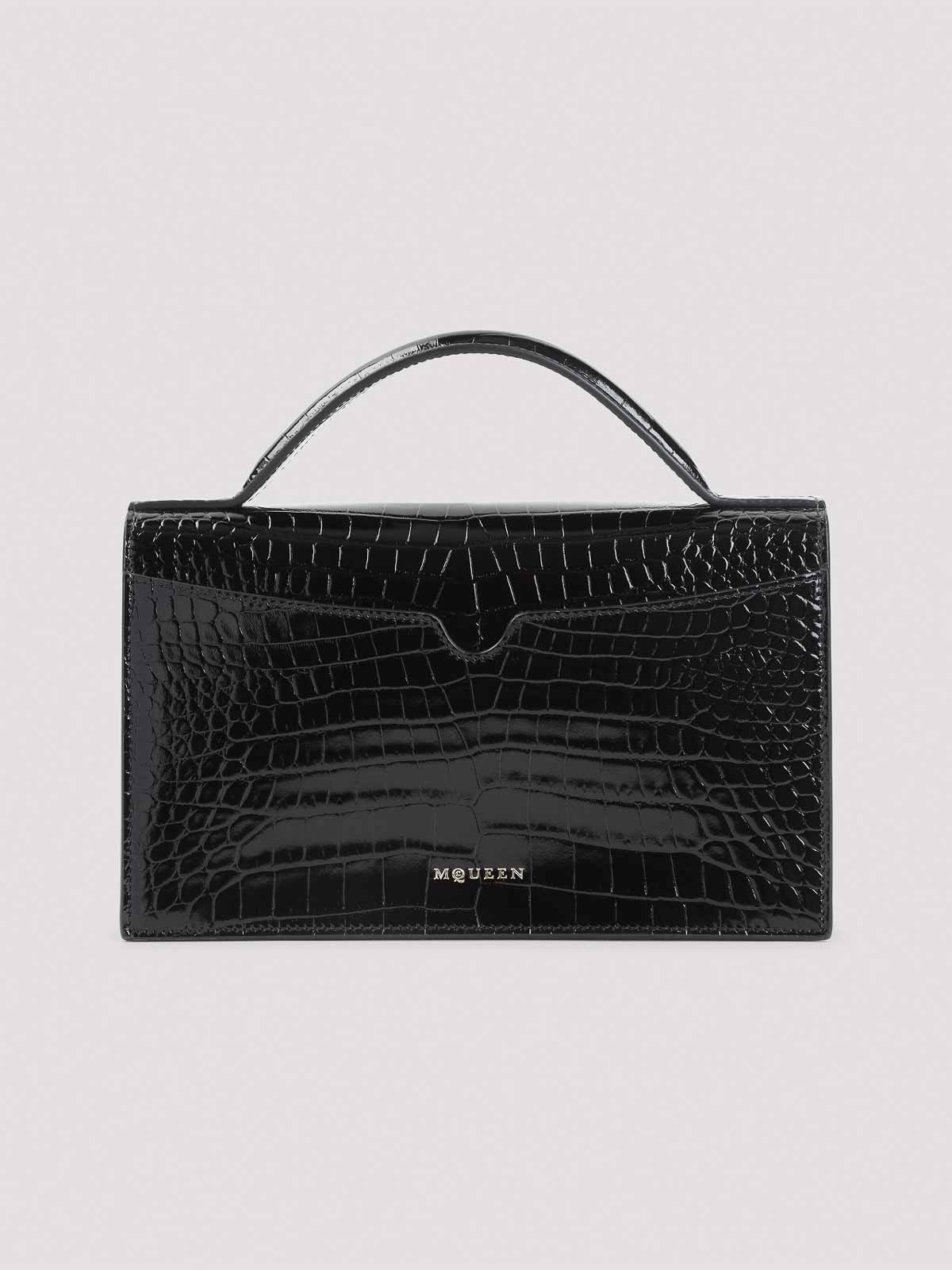 Alexander Mcqueen ミディアムブラックレザークラッチ。ブラックのクロコ型押しレザー製で、ゴールドトーンのハードウェア、トップハンドル、フロントシグネチャースカル、隠しファスナー、取り付け可能なチェーンショルダーストラップ、インナーカードスロット、フルライニングが特徴です。