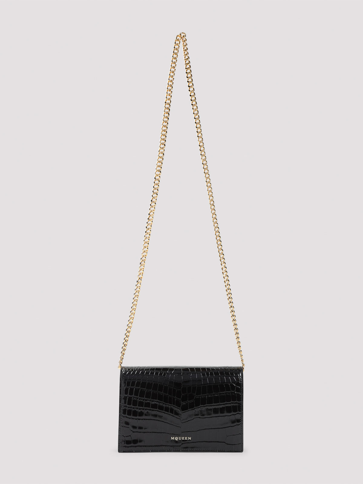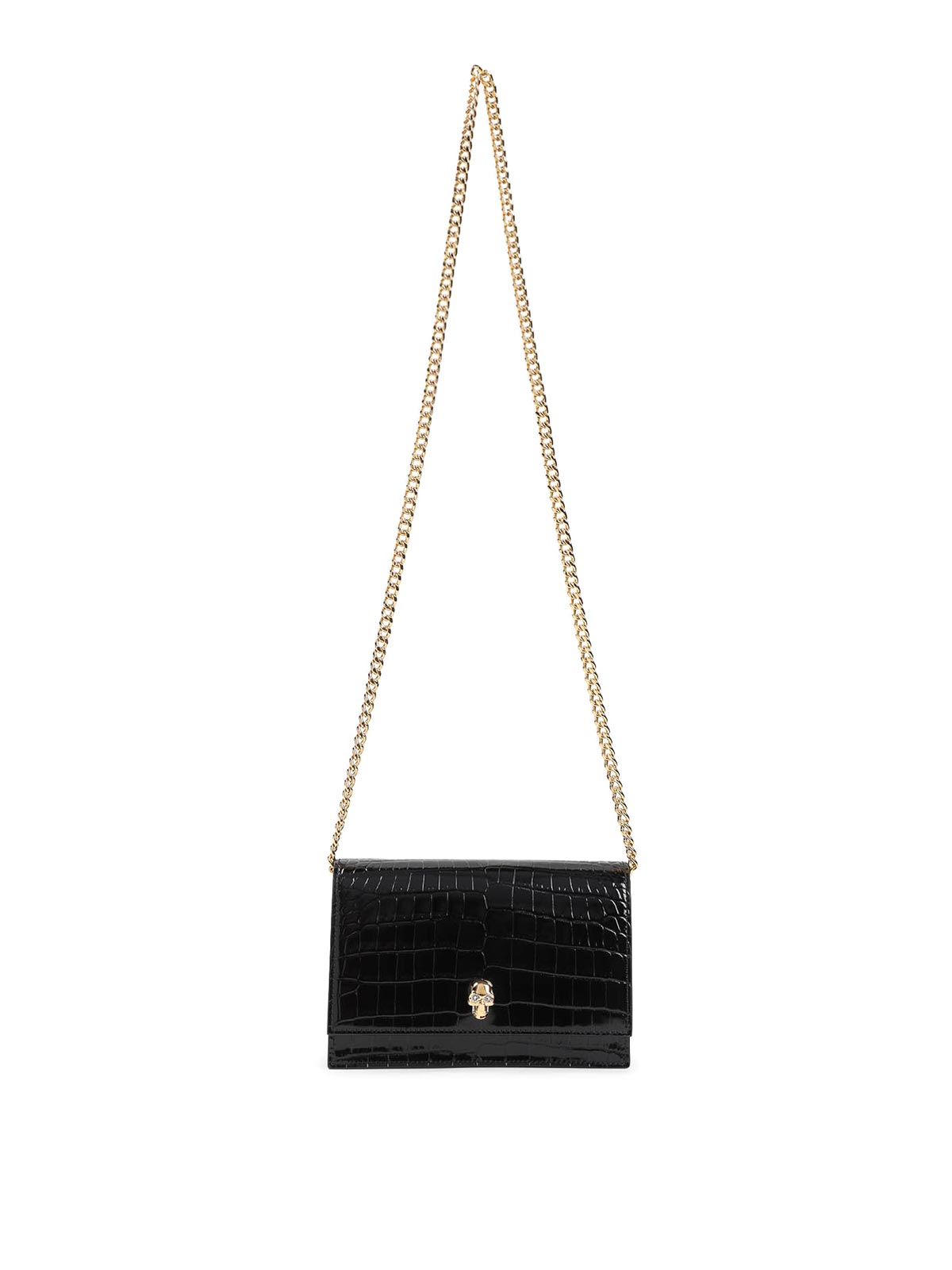 Alexander Mcqueen スモールスカルブラックレザークラッチ。ブラックのクロコ型押しレザー製で、ゴールドトーンの金具、トップチェーンのショルダーストラップ、フロントシグネチャースカル、隠しファスナー、インナーカードスロット、フルライニングが特徴です。