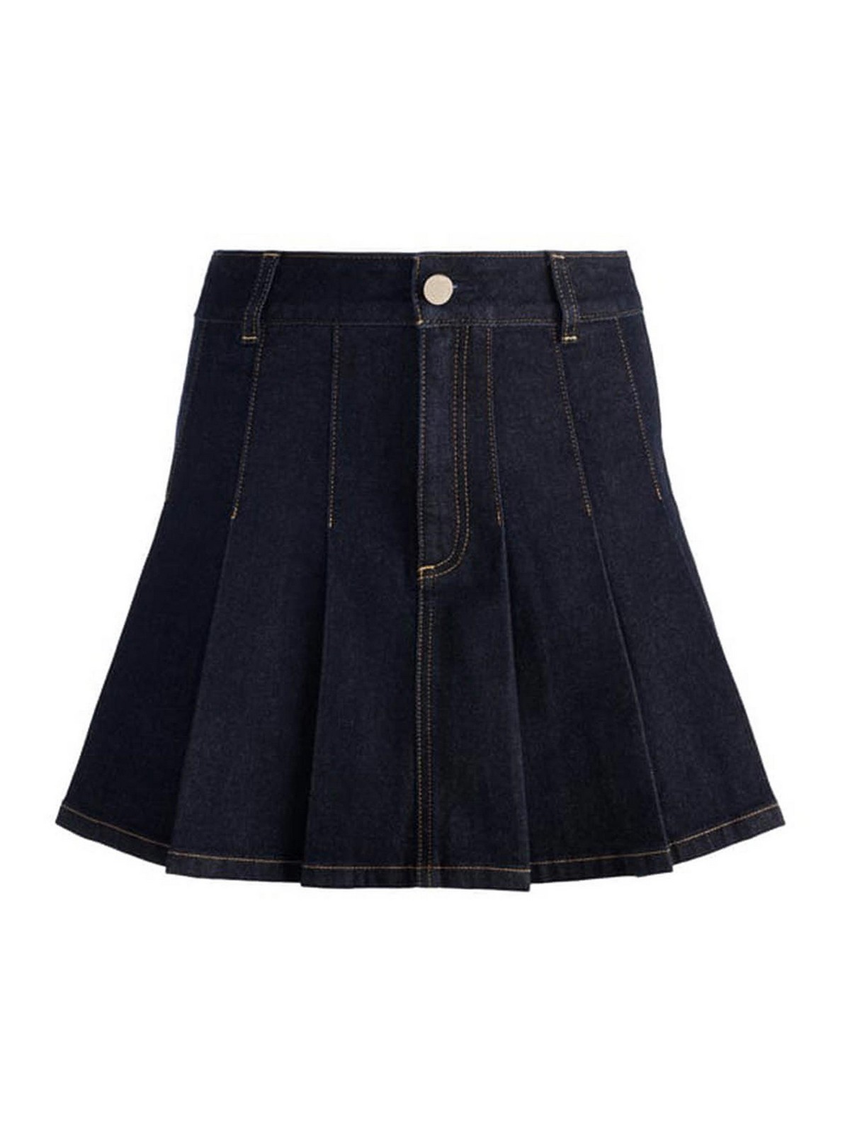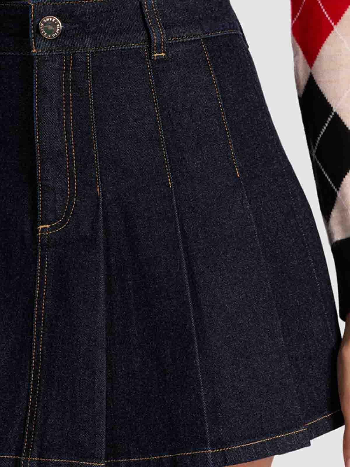 プリーツデニムデザイン、隠しファスナーとボタン付きフロントクロージャー、サイドポケット、ベルトループ付きウエストバンド、クロップド丈。素材:綿 94%、エラストマルチエステル 5%、エラステイン 1%