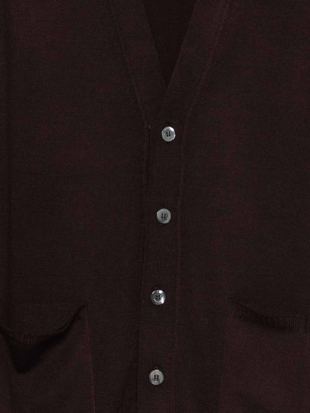Vネックのサイドポケット2つとボタンが付いた茶色のニットベスト