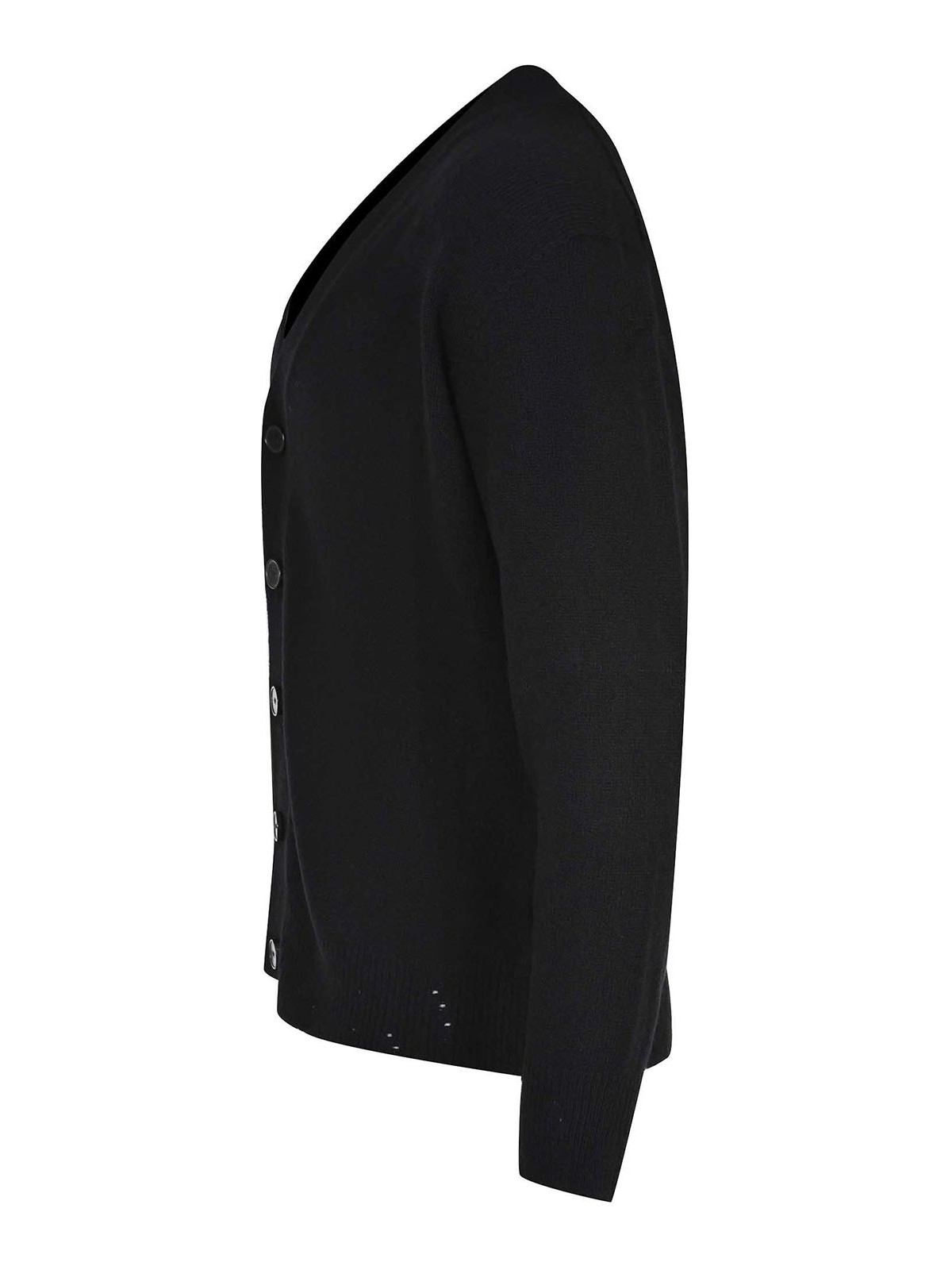 ブラックカラーのウールとカシミアの混紡で作られたアマランスカーディガン。Vネック、フロントボタン留め。長袖。リブ編みの袖口と裾。ウール 90%、カシミア 10%。イタリア製