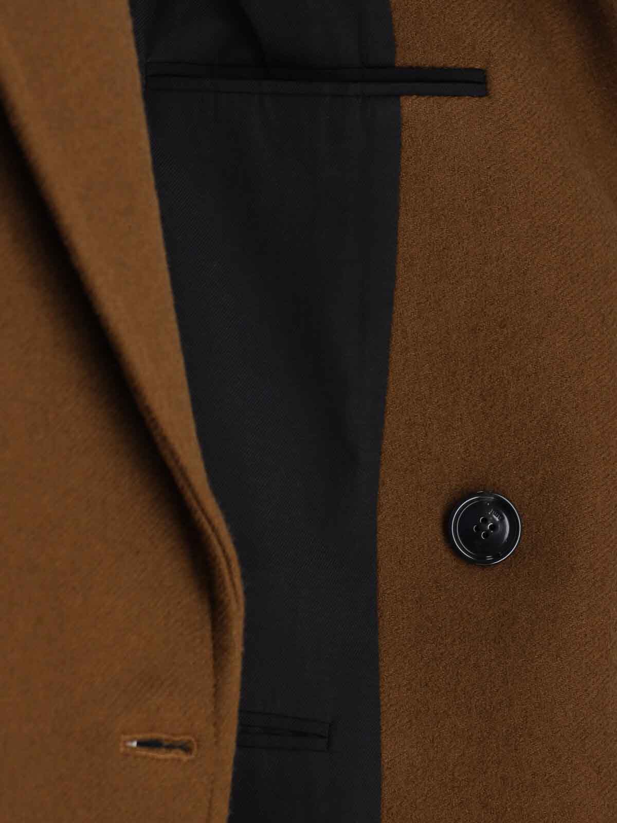 Ami ダブルブレストコート、ブラウンバージンウール、ピークラペル、ボタンクロージャー、フロントポケット、サイドポケット2つ、ボタン付きカフス、マキシバックベント、ストレートヘム。