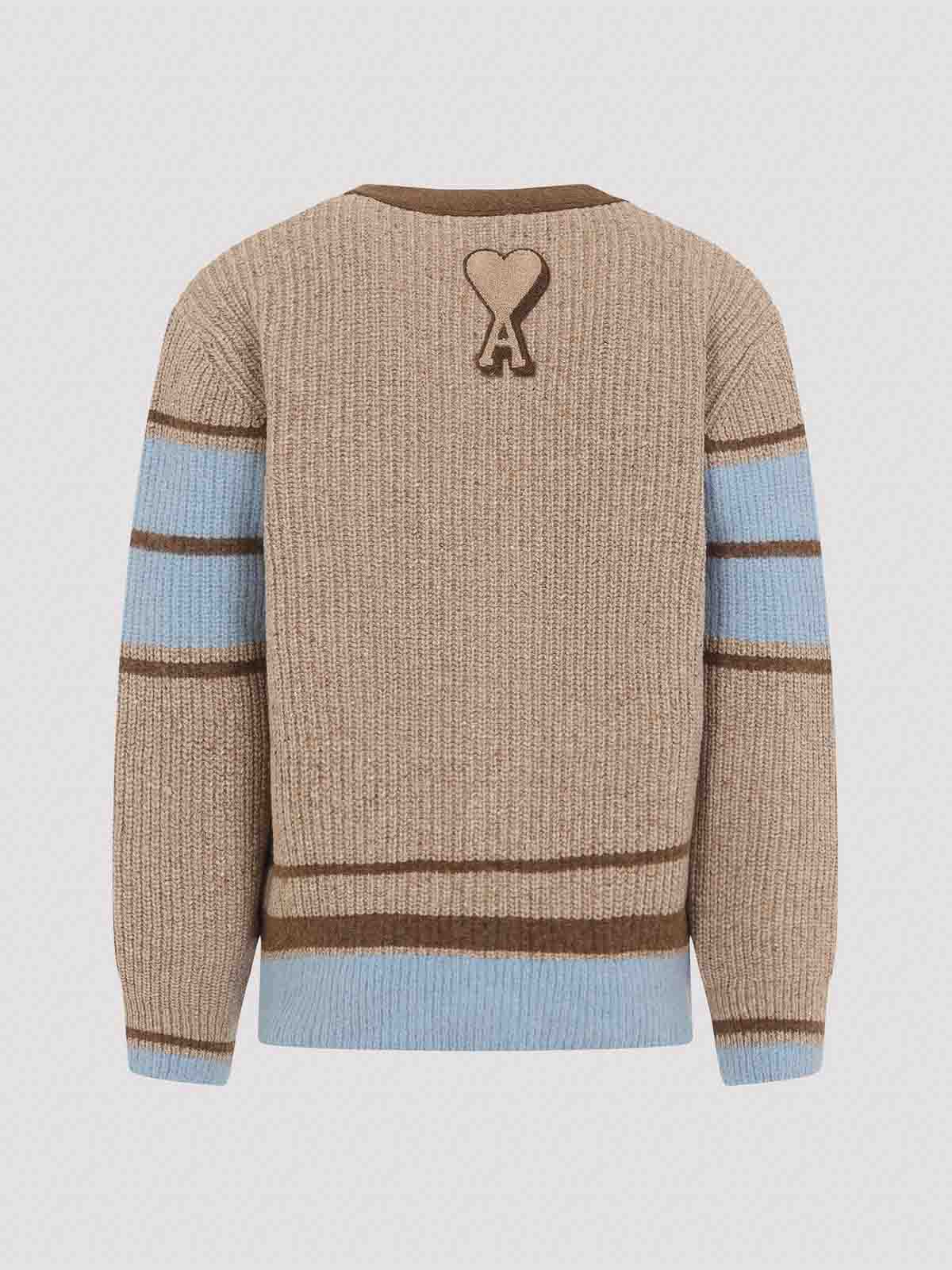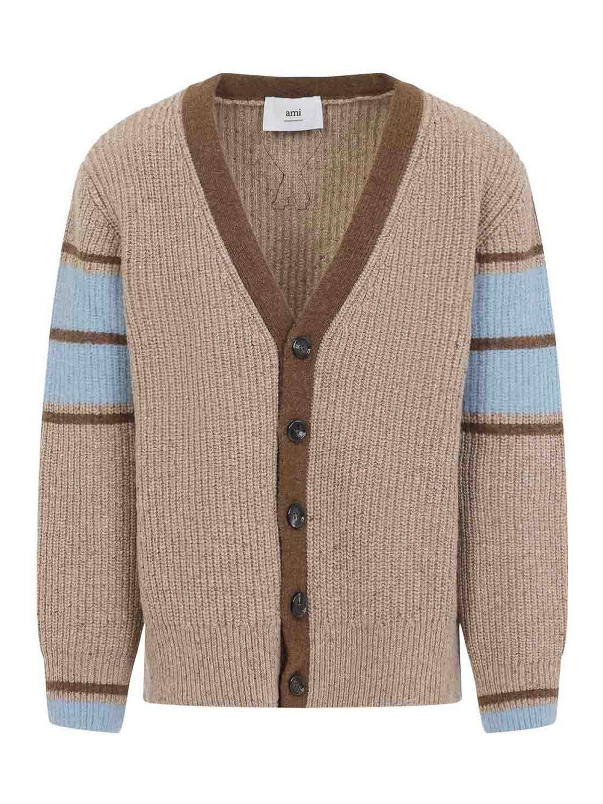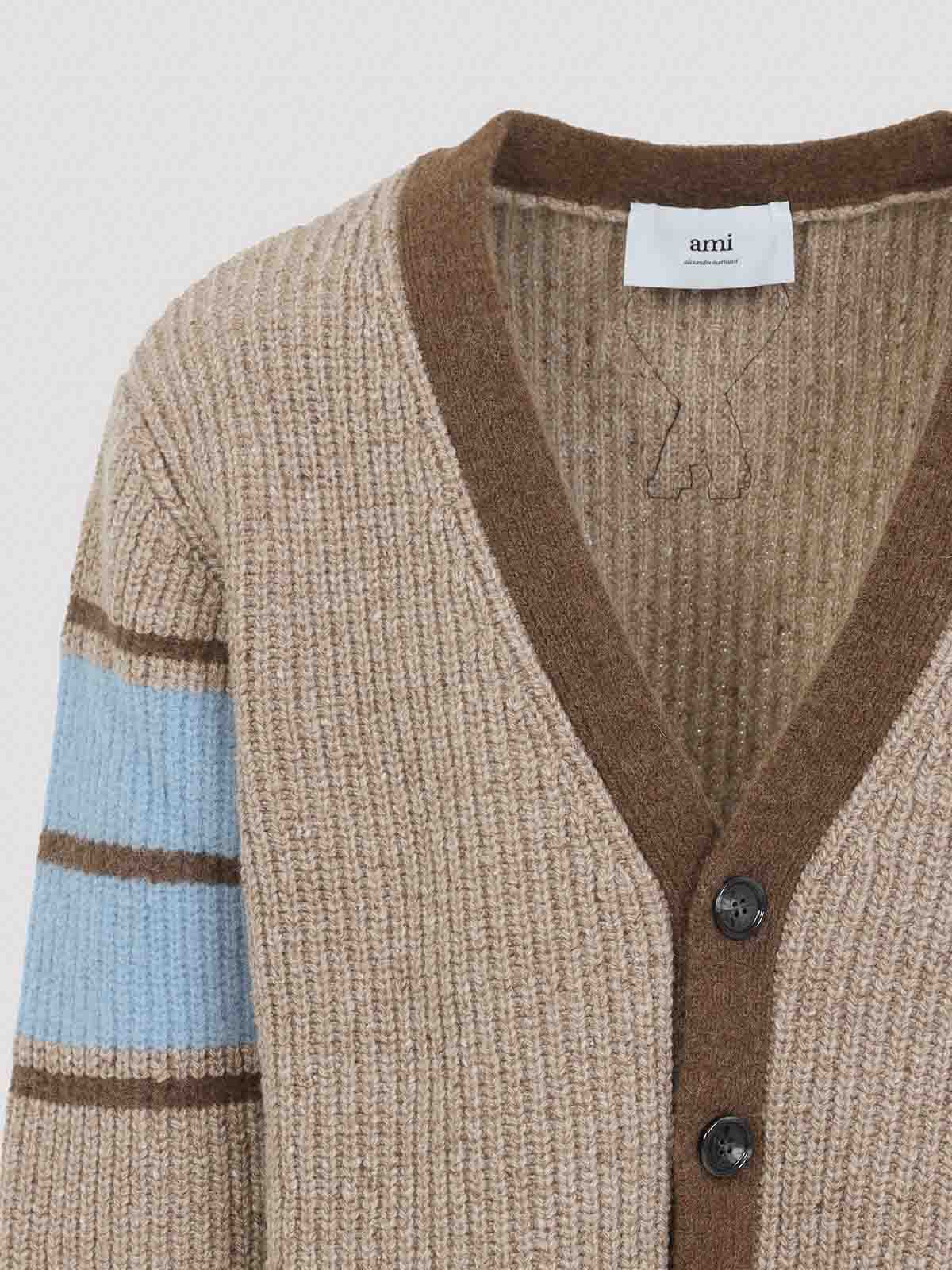 Ami キャメルベージュウールカレッジカーディガン。ピュアウールカーディガン、Vネック、フロントボタン留め、バックパッチロゴ、ロングスリーブ、リブ編みのカフス、ストレートヘム、ニットデザイン。ブラウンエッジ、袖にはライトブルーのディテール。