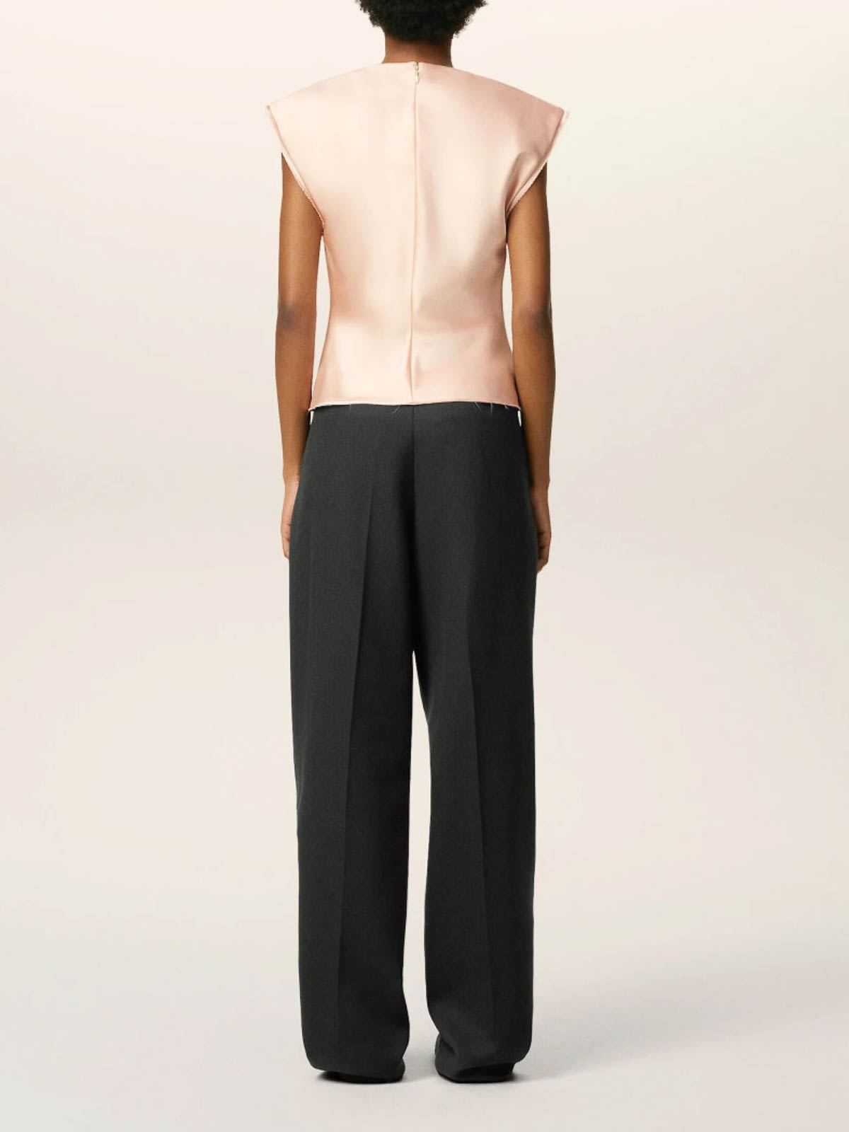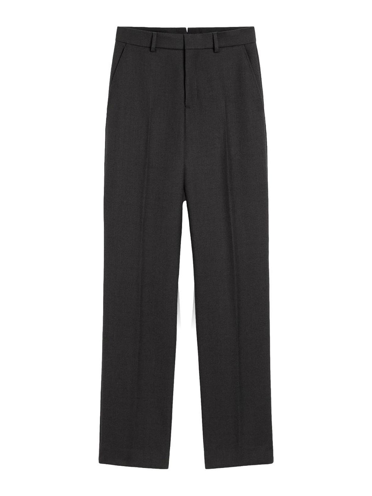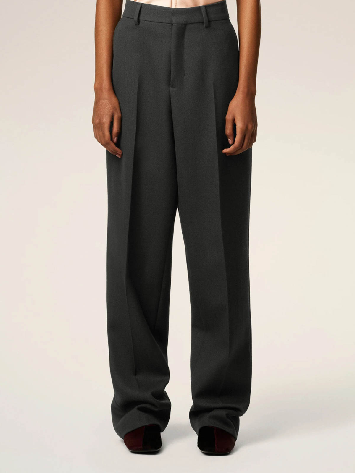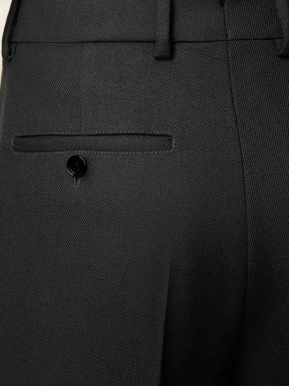 デザイナーカラー:アンスラサイト、ウール、ワイドフィット、ジッパー付きフロントフライ、ホーンボタン、サイドポケット2つ、ボタン付きバックウェルトポケット2つ、バックベルトにVカットのディテール、膝までのフロントライニング、フロントプリーツ。