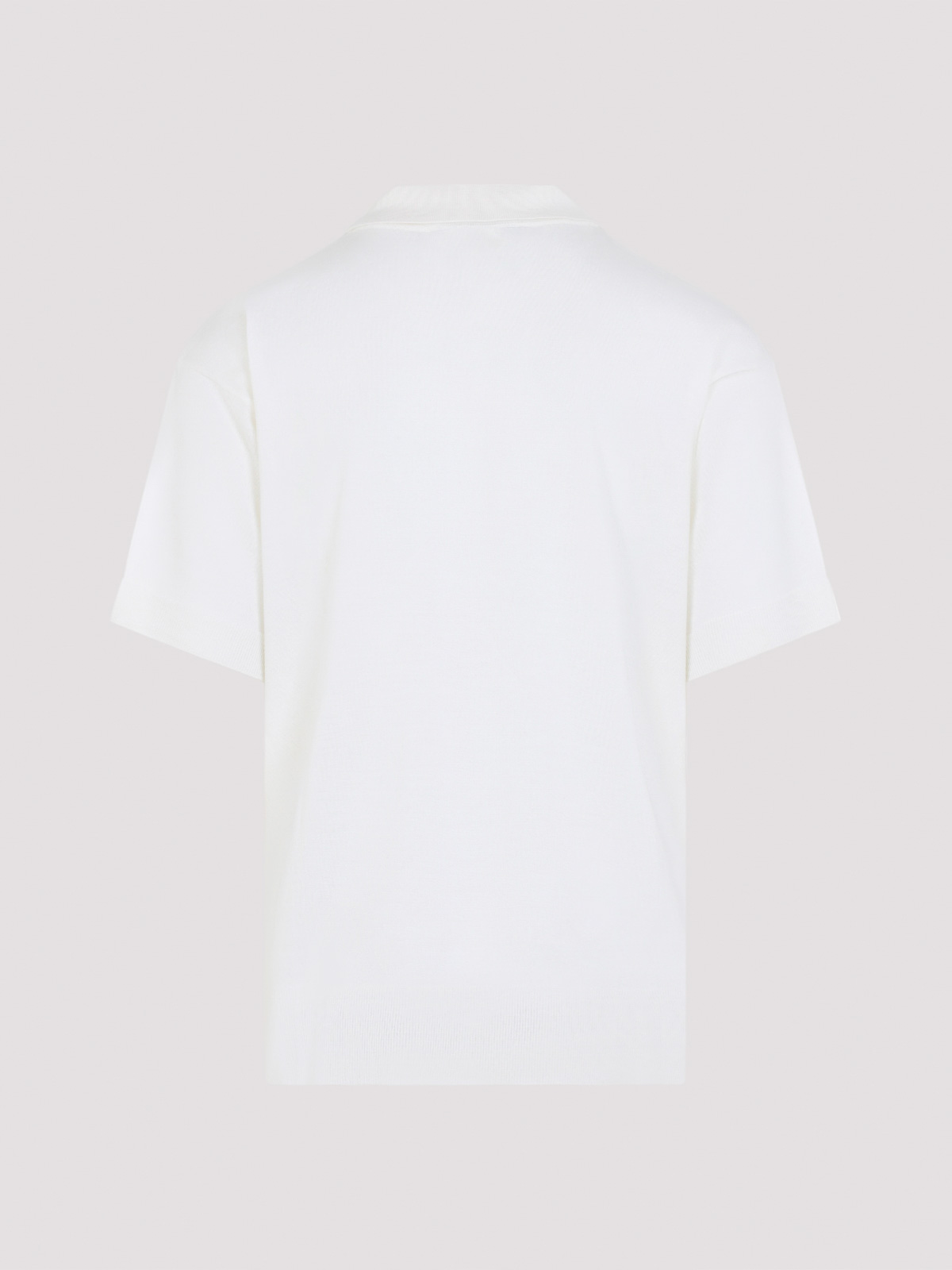 同系色のアミ・ド・クールをあしらったクリームホワイトのバージンウールポロシャツ。バージンウールとシルクのブレンドで作られています。クラシックなポロカラー、ドロップショルダー、ショートスリーブ、サイドスリットディテール、アシンメトリーヘム。