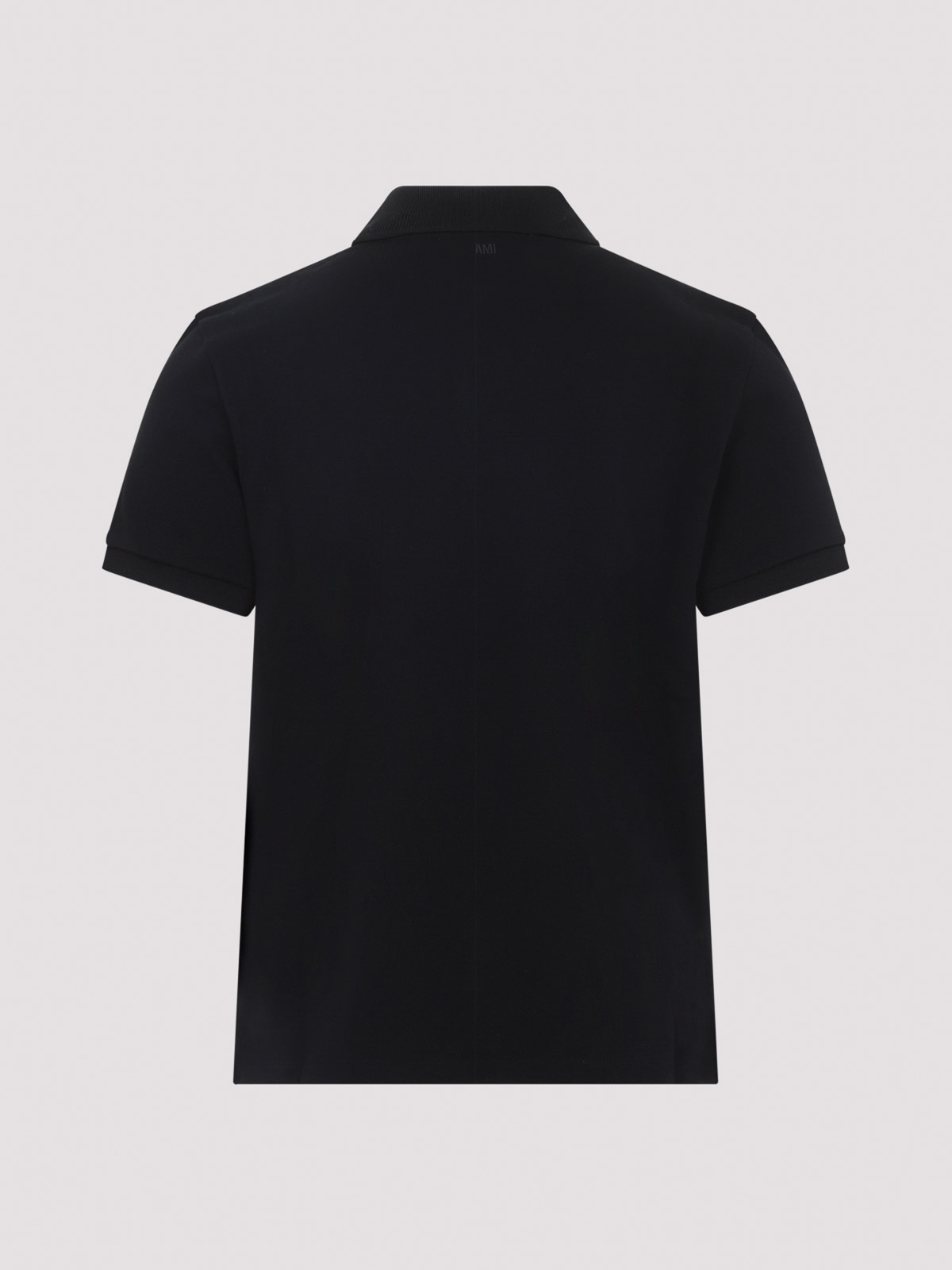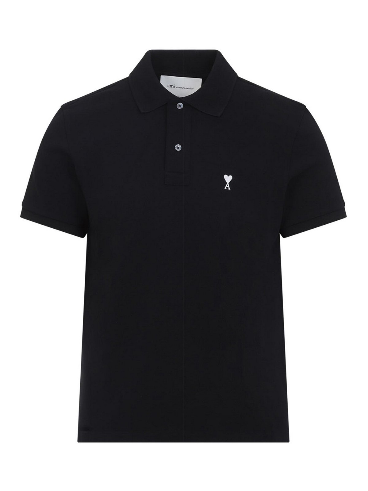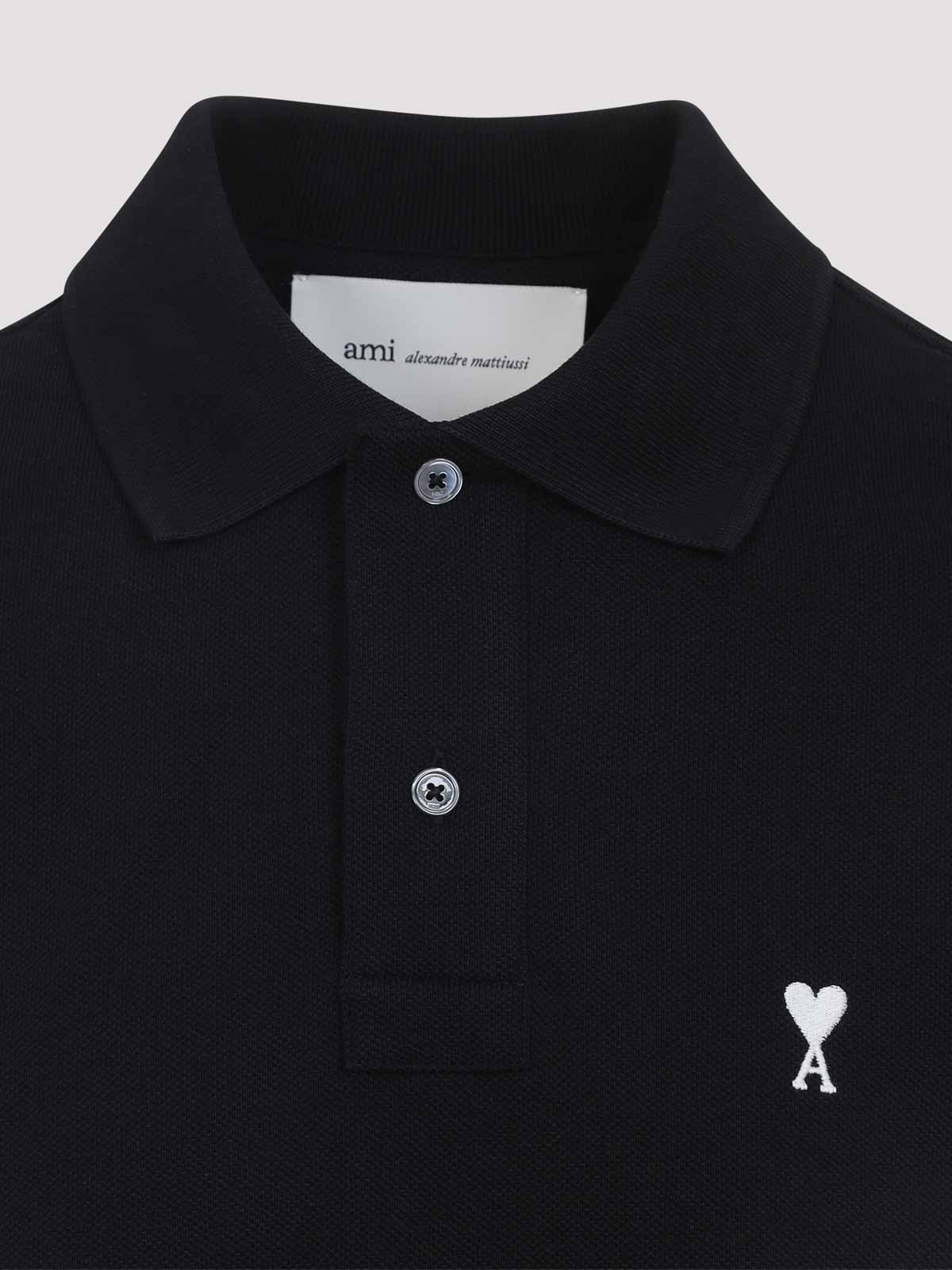 Ami Contrast ami de coeur ブラックコットンポロシャツ。ブラックのコットンピケ製で、先のとがった襟、前面に2つのボタン留め、胸にコントラストの効いた白いロゴの刺繍、リブ編みの袖口が付いた半袖、サイドスリット、ストレートヘム、クラシックフィットが特徴です。