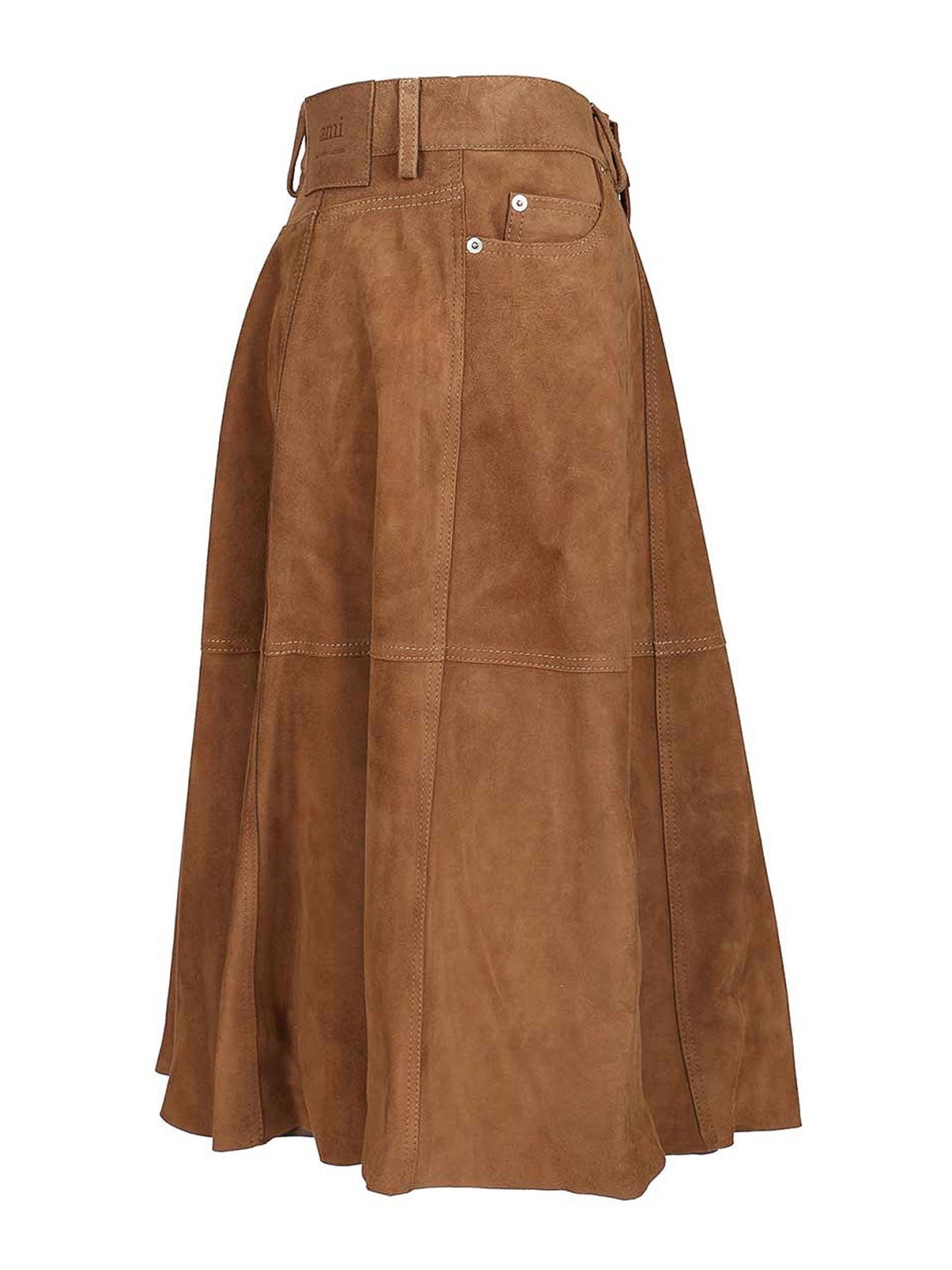 ジッパー付きアミゴートスエードスカート、ami parisの刻印入りデニムメタルボタン、ami parisの刻印入りデニムスタッズ、背面にamiアレクサンドルマティウッシのパッチ