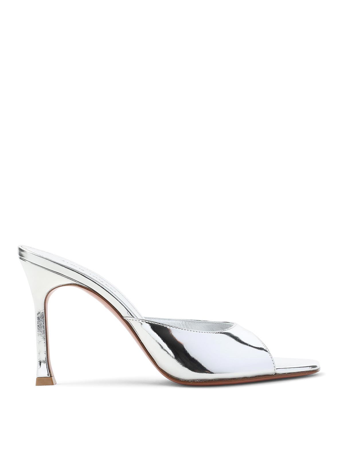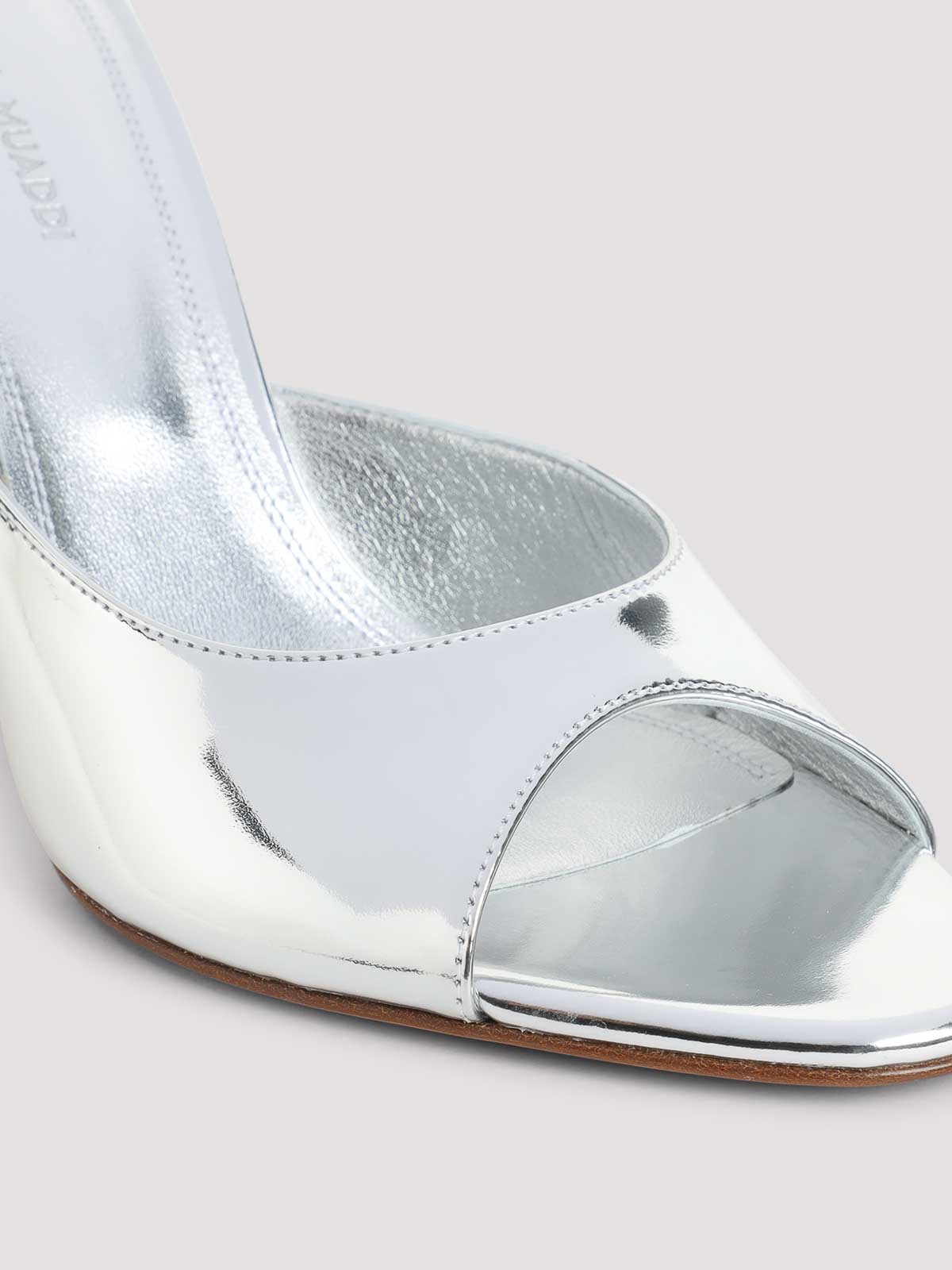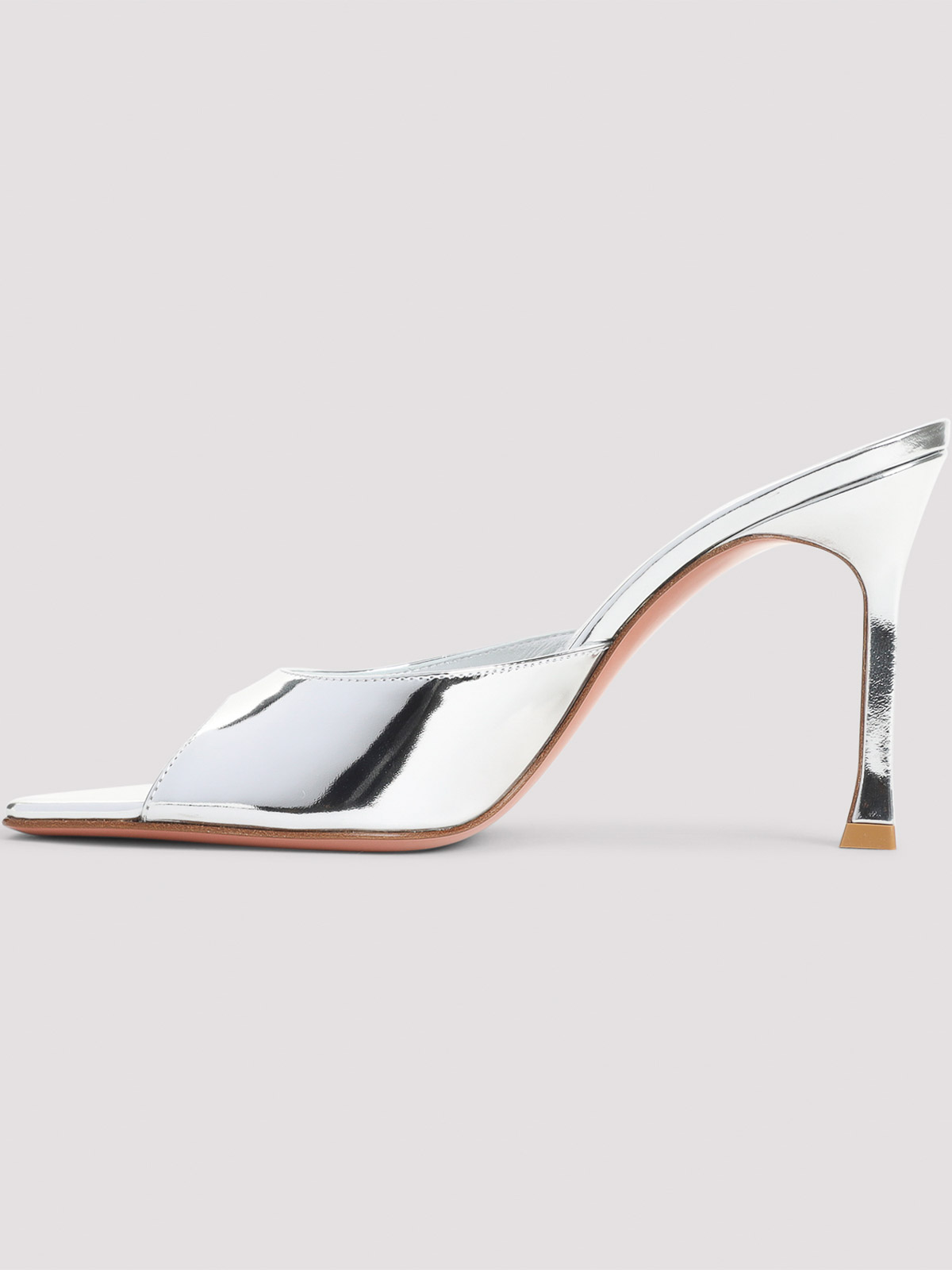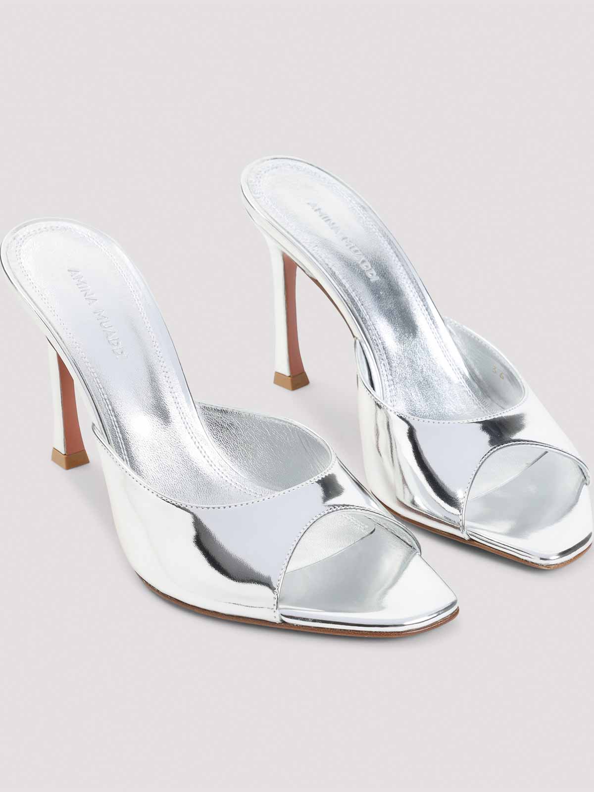 Amina muaddi シルバーレザー Alexa 95 スリッパ。ピュアシルバーレザースリッパ、オープンスクエアトゥ、トップトーナルストラップ、スリッポンスタイル、トーナルハイヒール、レザーソール。