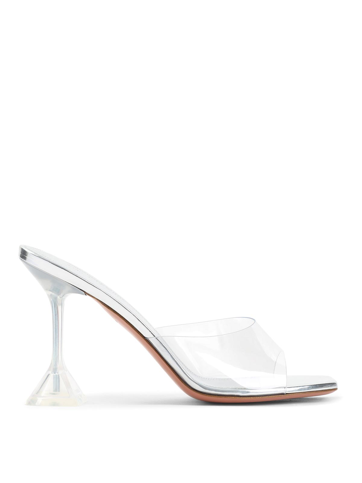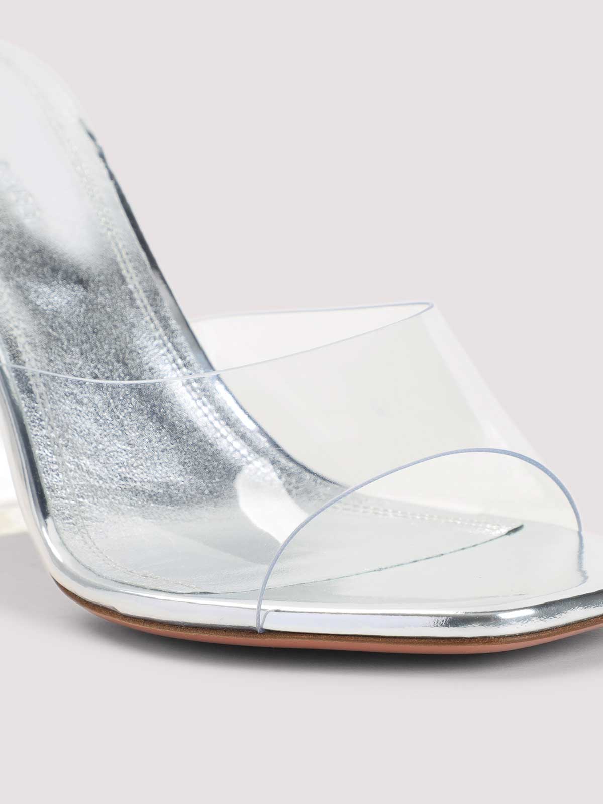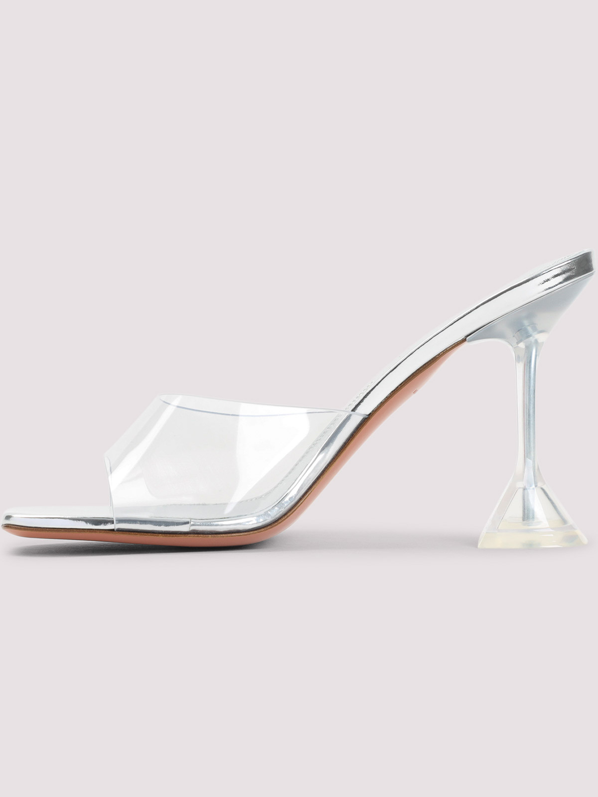 Amina muaddi 透明レザールピタガラススリッパパンプス。シルバーレザーパンプス、スクエアオープントゥ、トップ透明ポリ塩化ビニルストラップ、スリッポンスタイル、砂時計透明ヒール、レザーソール。