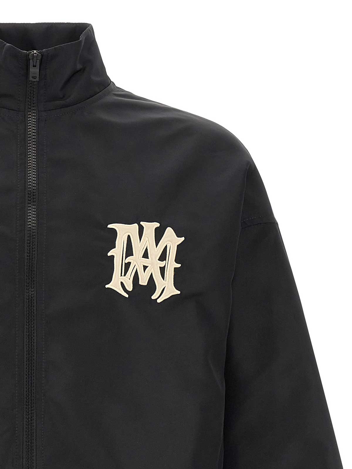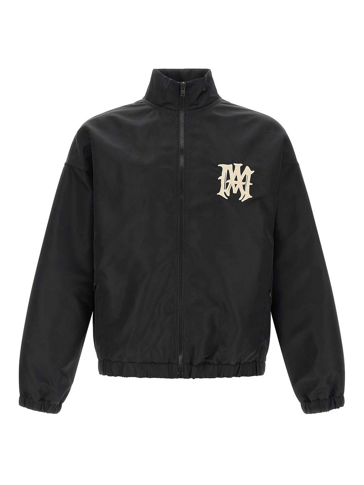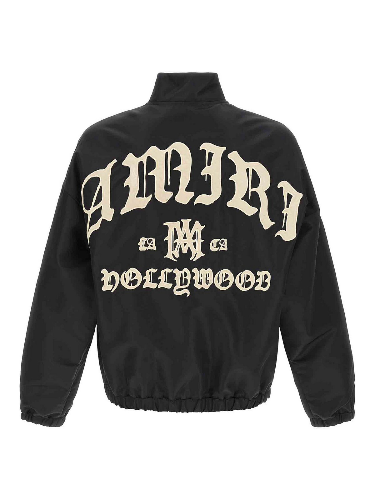 amiri hollywoodの撥水加工ナイロンジャケット、前面と背面にフロックパッチ、スタンディングカラー、フロントジッパー、ポケット、伸縮性のある袖口とドロップショルダー付きの長袖、伸縮性のあるヘム。この衣服には特別な加工が施されているため、色合いや色を意図的に変化させ、衣服に独自の特徴を加えています。