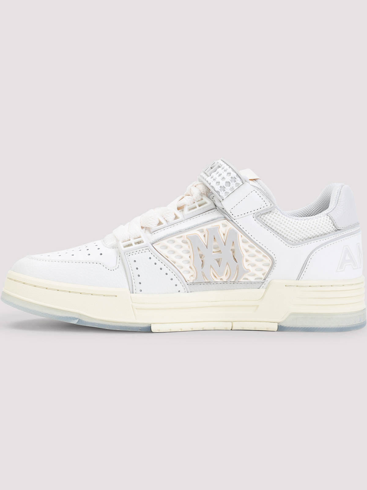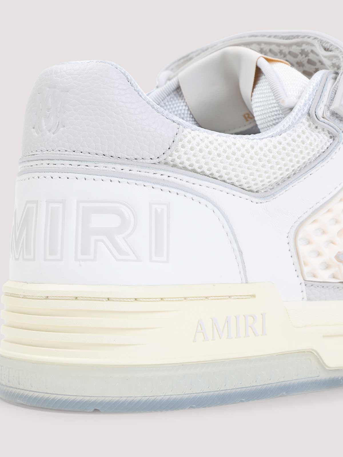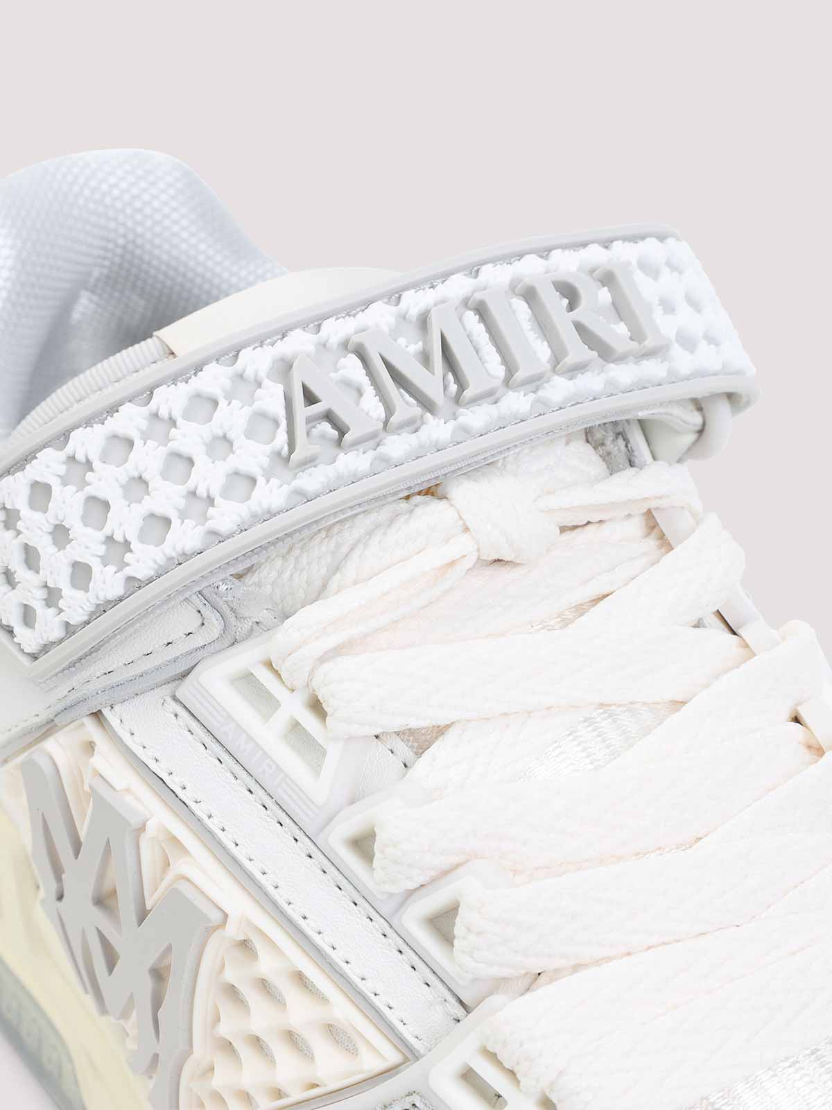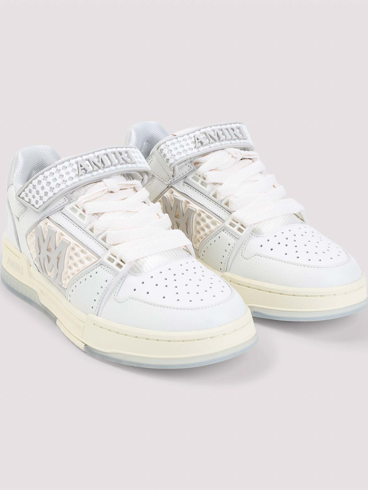 Amiri ホワイトカウレザー maスカイラインスニーカー。ピュアカウレザースニーカー、ラウンドネック、トップパーフォレーテッドディテール、トップトーナルレースアップファスナー、トップホワイトとグレーのロゴストラップ、サイドグレーのシグネチャーロゴ、サイドにグレーのシグネチャーロゴ、アッパーにホワイトとグレーのレザーディテール。ホワイトとグレーのラバーソール、ソールにサイドグレーのレタリングロゴ。