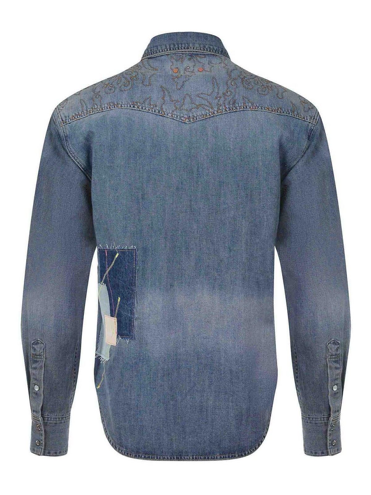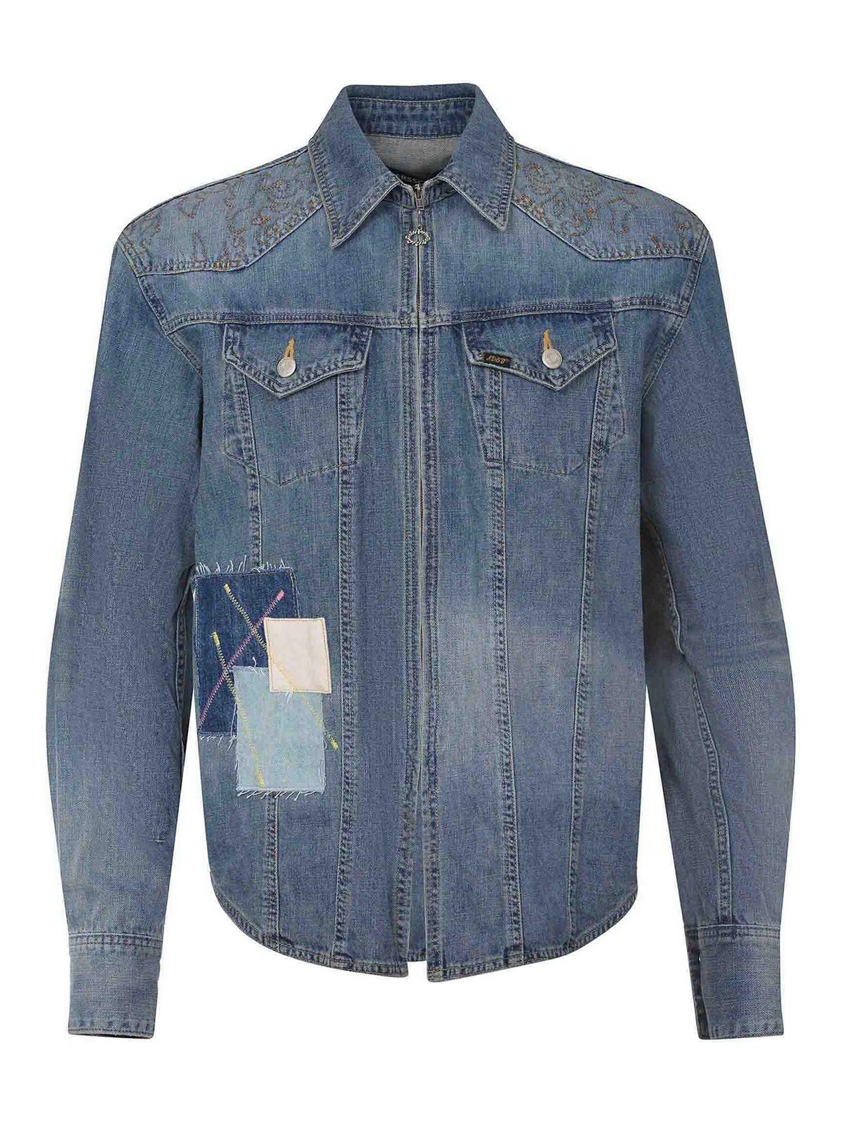 Anderssonベルシャツブルーデニムスリーブカフス、ボタン付きカフス、胸にクラシックな襟付きジッパー、フラップ付きポケット、サイドにボタンコントラストの効いた刺繍パッチ