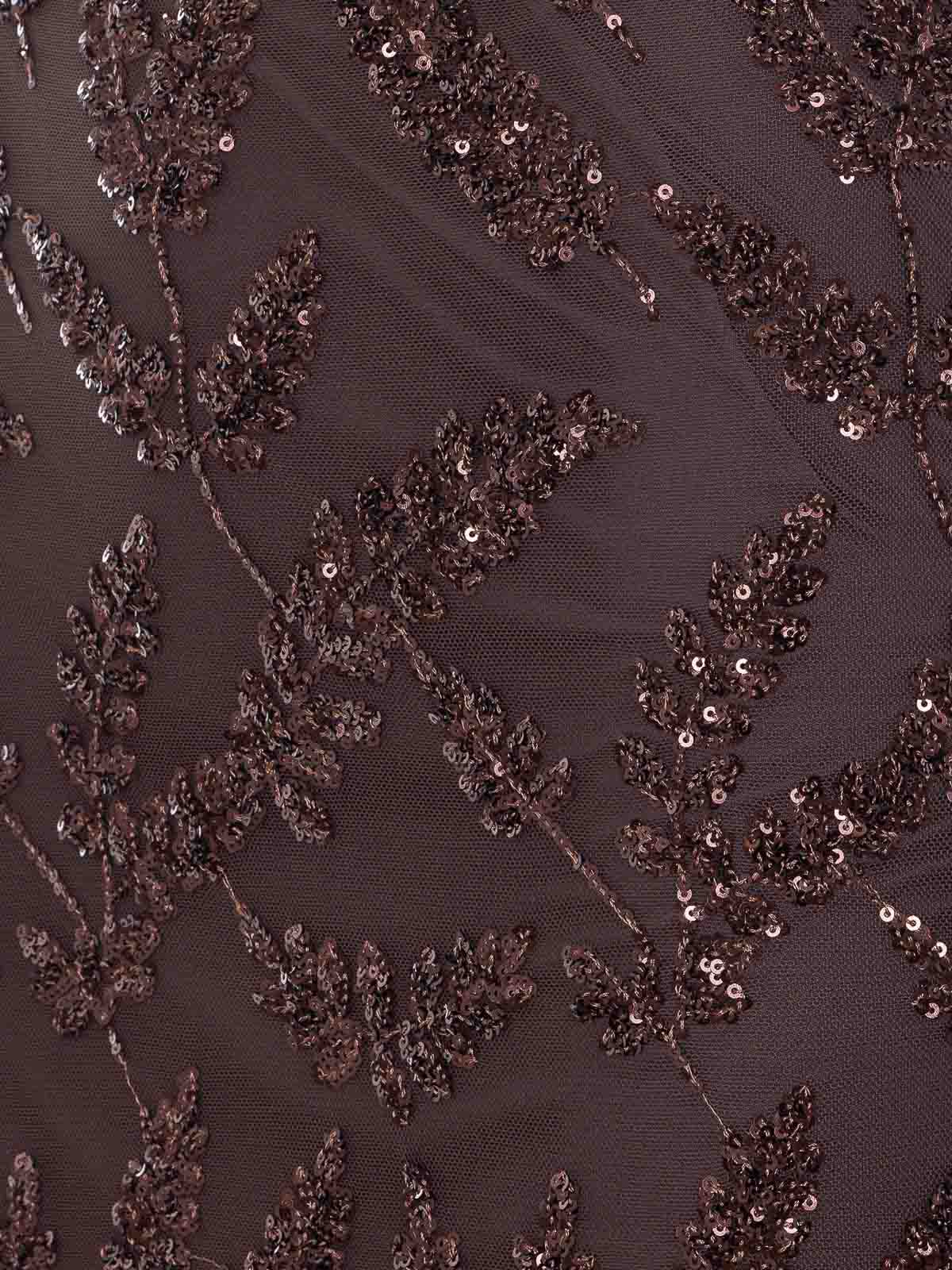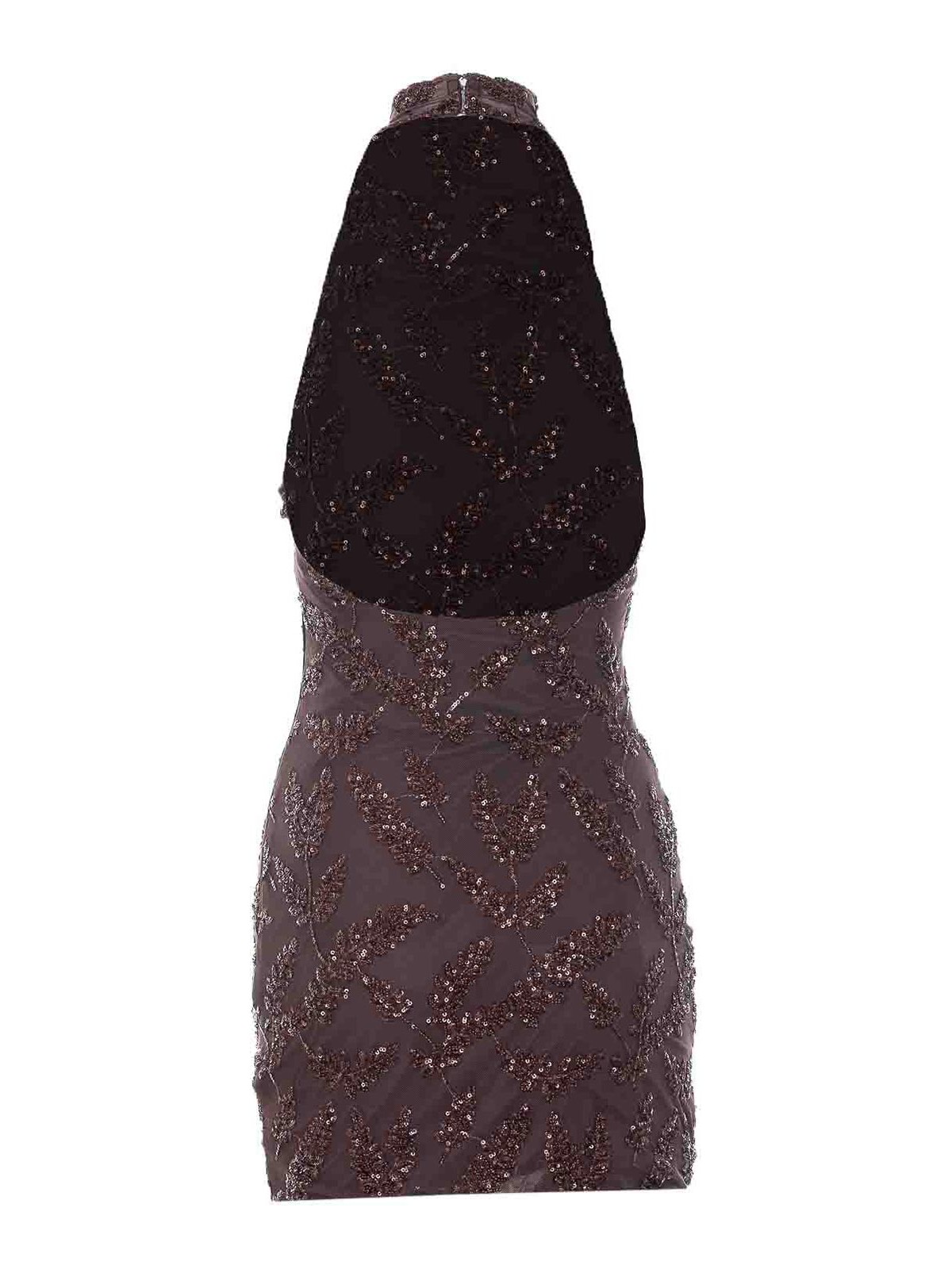 Aniye by diabolic チョコレートブラウンウマタートルドレス、ホルターネック、ロゴカーソル付き横ファスナー、Vバック、スパンコールと刺繍、透明効果、裏地付き