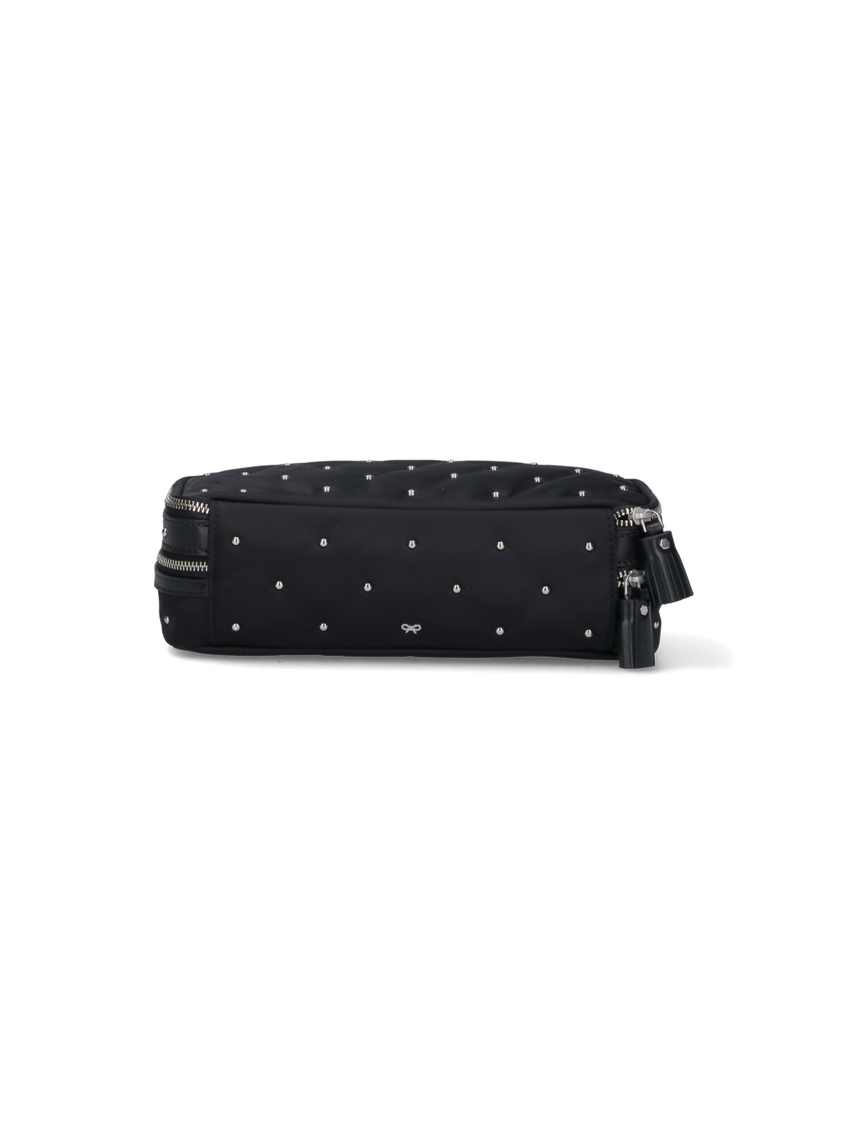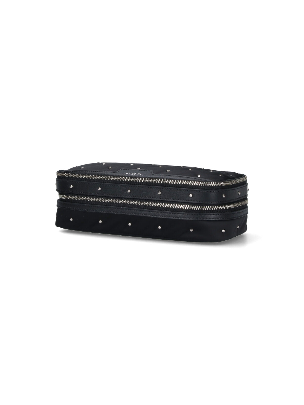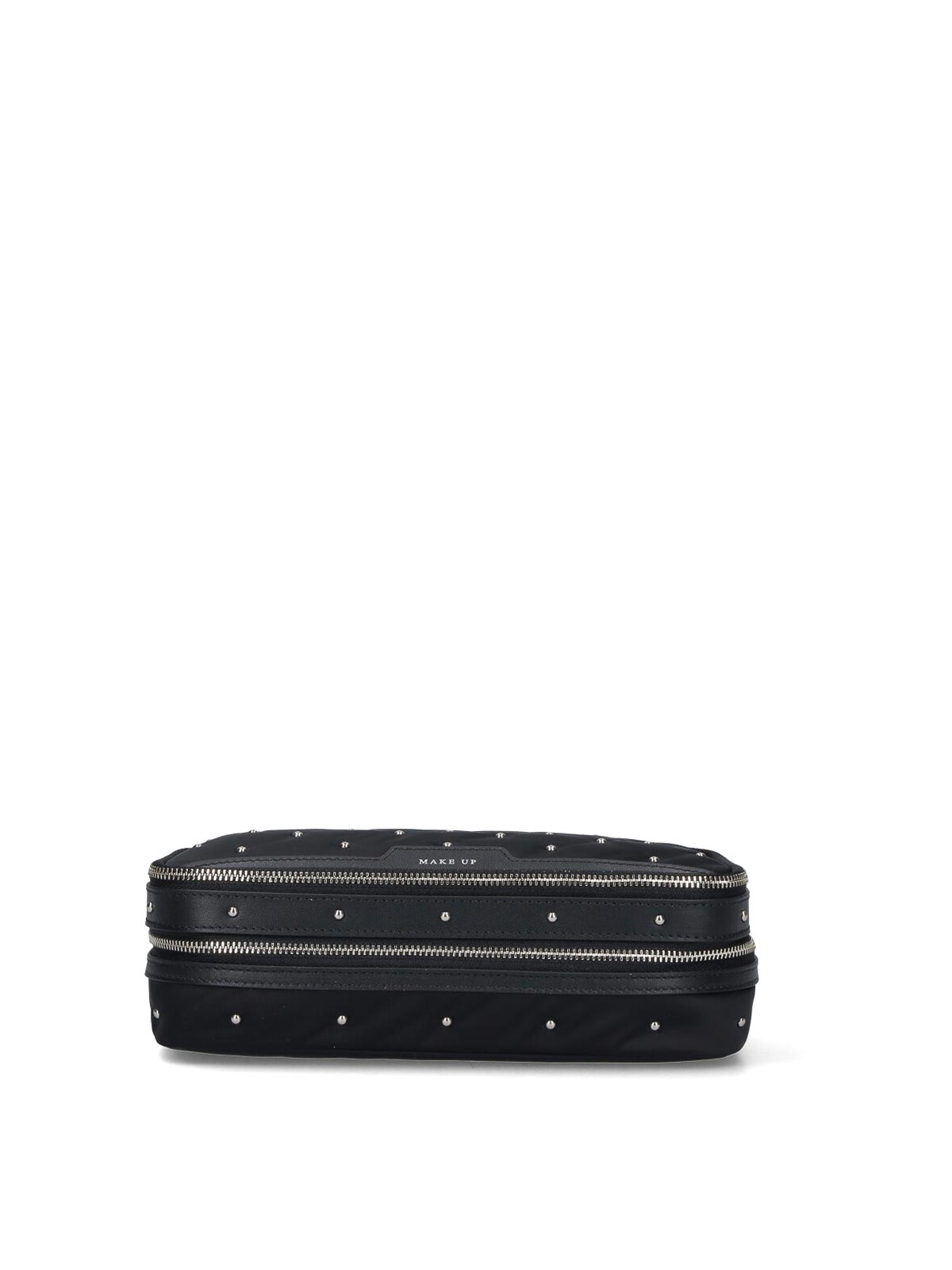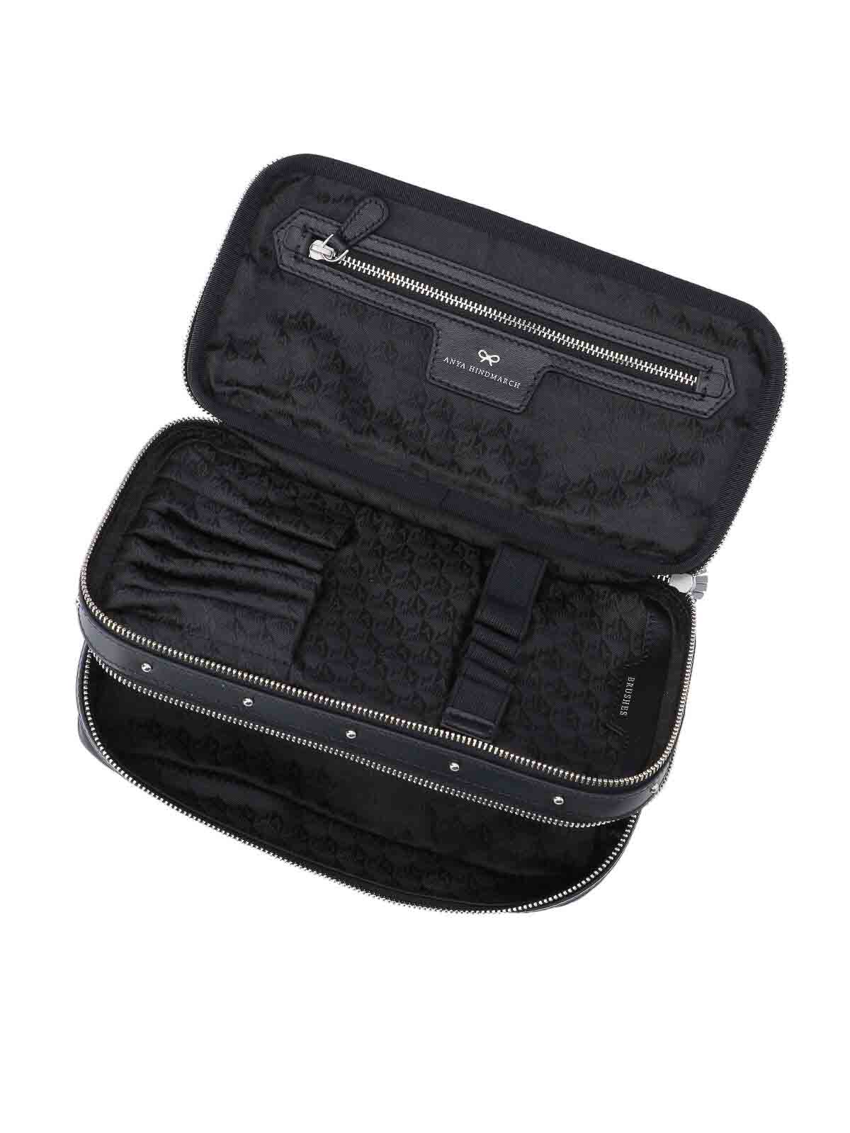 どんなHindmarchのメイクアップポーチにもブラックのリサイクルポリエステル製スタッズ付き、ファスナー開閉、全面シルバーメタルの金具とスタッズのディテール、2つのメインジッパーコンパートメント、1つの内部ファスナーポケット。