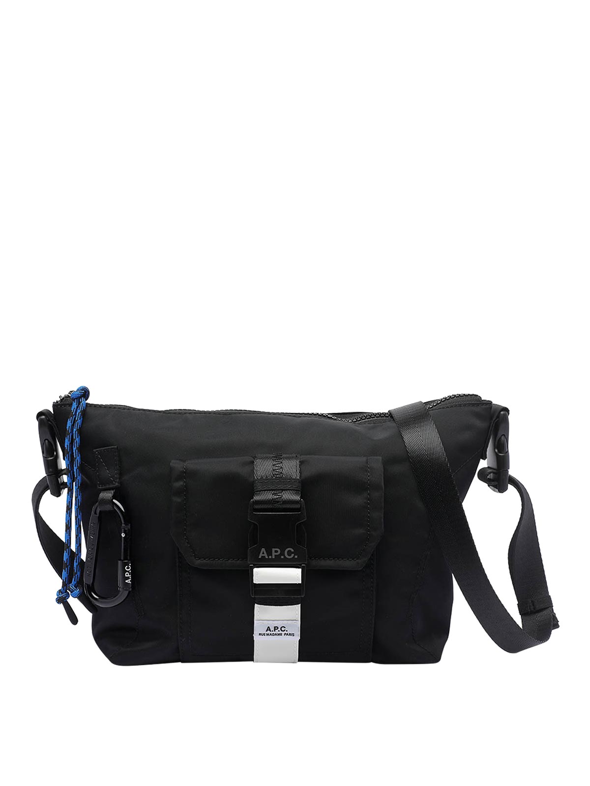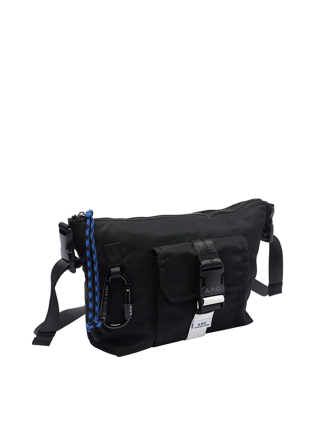 A.P.C. トレックバムバッグ、ファスナー開閉、内側オープンポケット、ファスナー付きポケット1つ、外側にファスナー付きポケット、バックル付き外ポケット、マグネット付きバックポケット1つ、調節可能で取り外し可能なショルダーストラップ