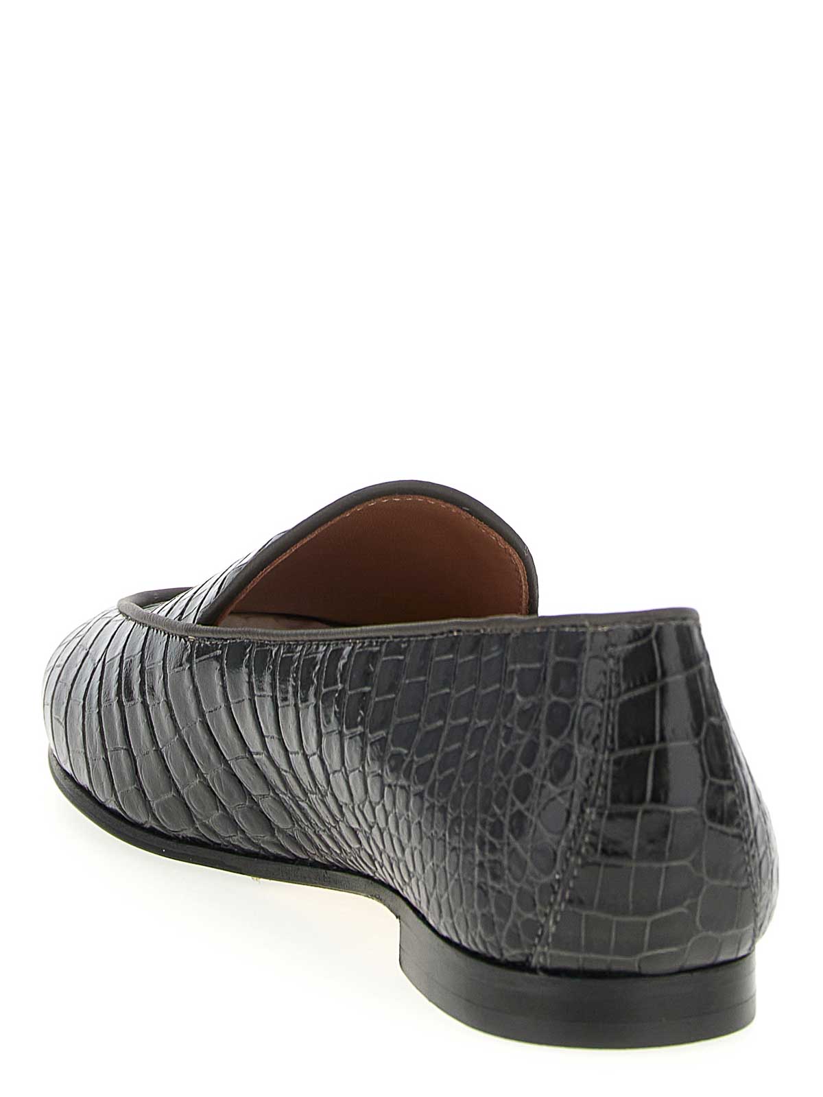 光沢のあるカーフレザーとウナギ革を使用したguanto'ローファー、スリッパモデル、丸いつま先、パッド入りインソール、レザーソール。
