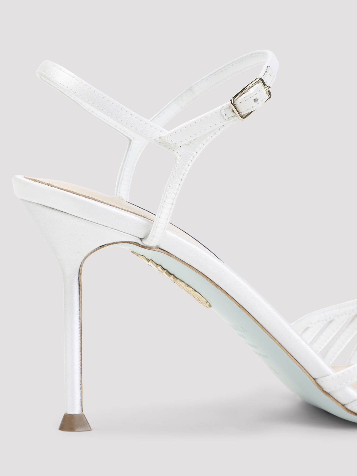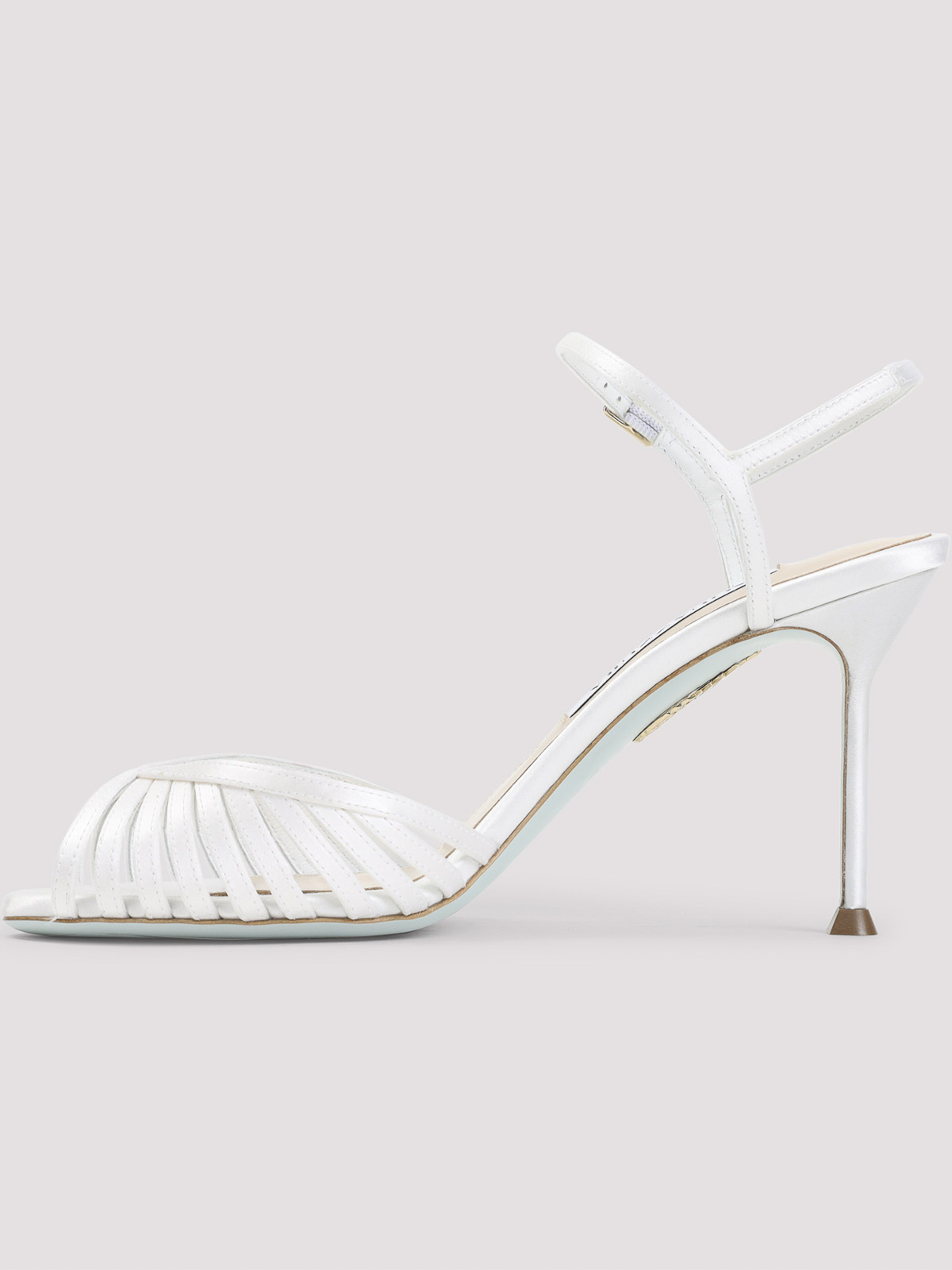 Aquazzurra オフホワイトのテキスタイルサテン製ホールドミーサンダル。テキスタイルサテンとレザー製、アーモンドオープントウ、トップトーナルストラップ、調節可能なアンクルストラップ、薄いトーナルハイヒール、レザーソール。