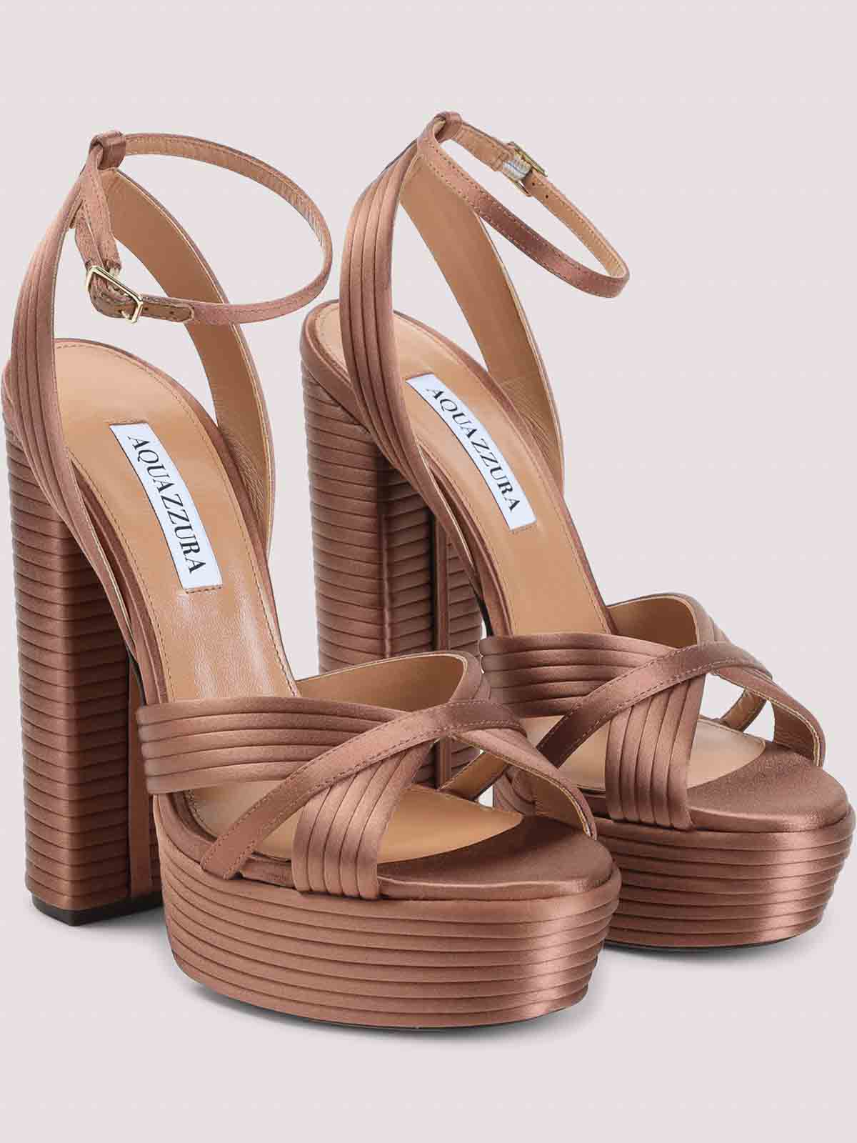Aquazzura サンデースブラウンサテンサンダル。茶色のサテンコードで作られたプラトーサンダル。丸いつま先、上部にクロスストラップ、バックル付きアンクルストラップ、オープンバック、ハイカバーブロックヒール、レザーライニング、インソール、アウトソールが特徴です。