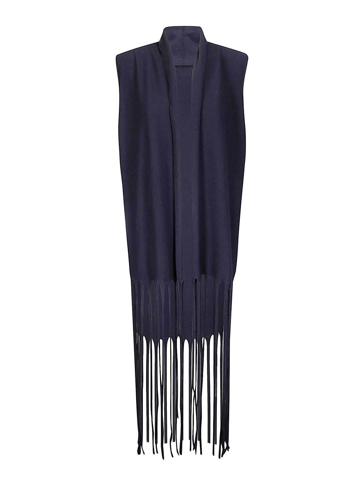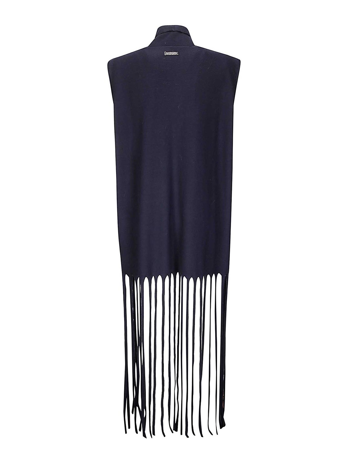 フリンジ付きメリノウールベスト、ターンアップカラー、クロージャーなし、背面にラベルが縫い付けられています。
