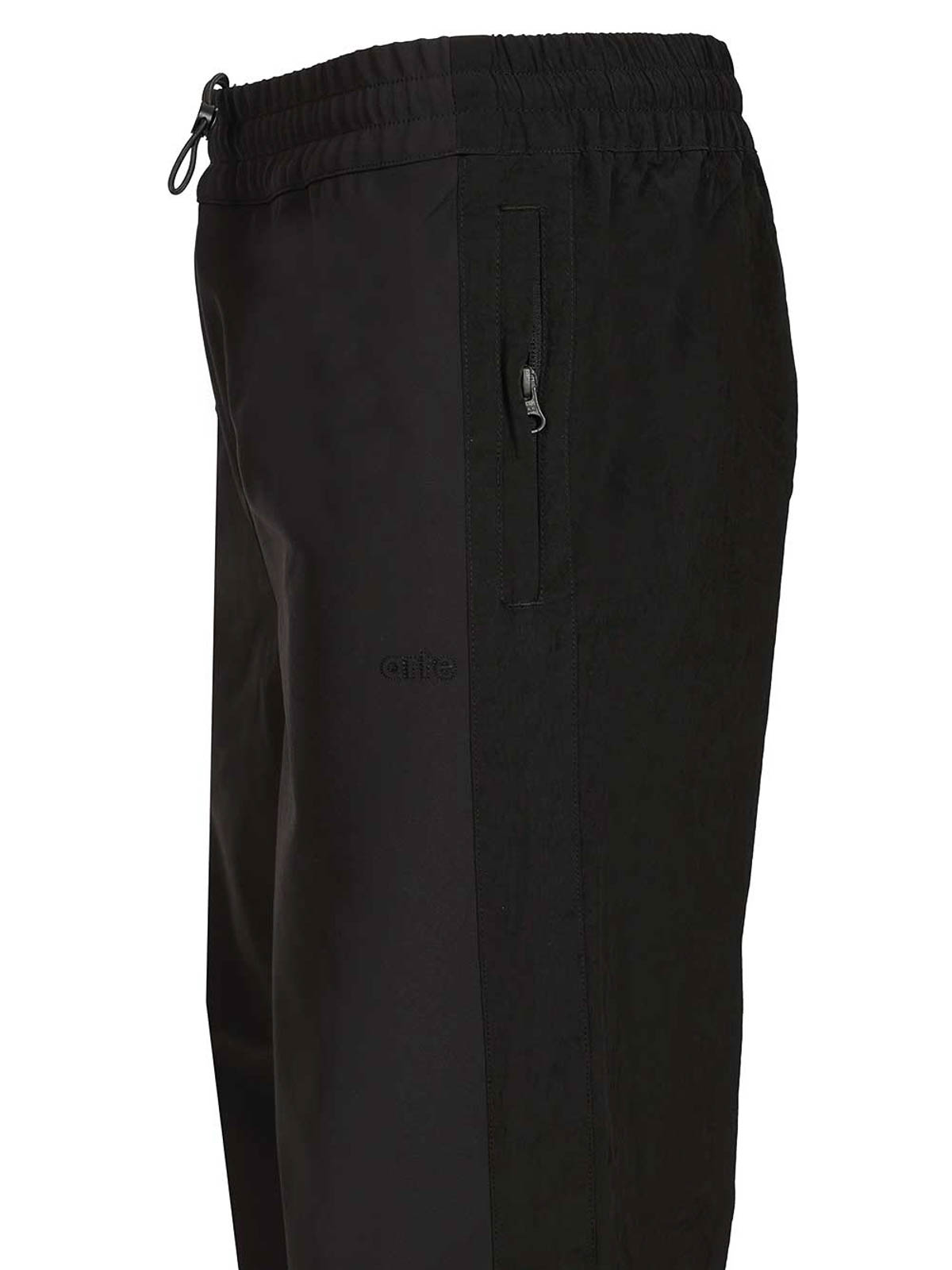 arteのナイロントラックスーツボトムは、サイドポケット2つ、伸縮性のあるウエストドローストリングカフスが特徴で、左上の縫い目にアルテのロゴがあしらわれています