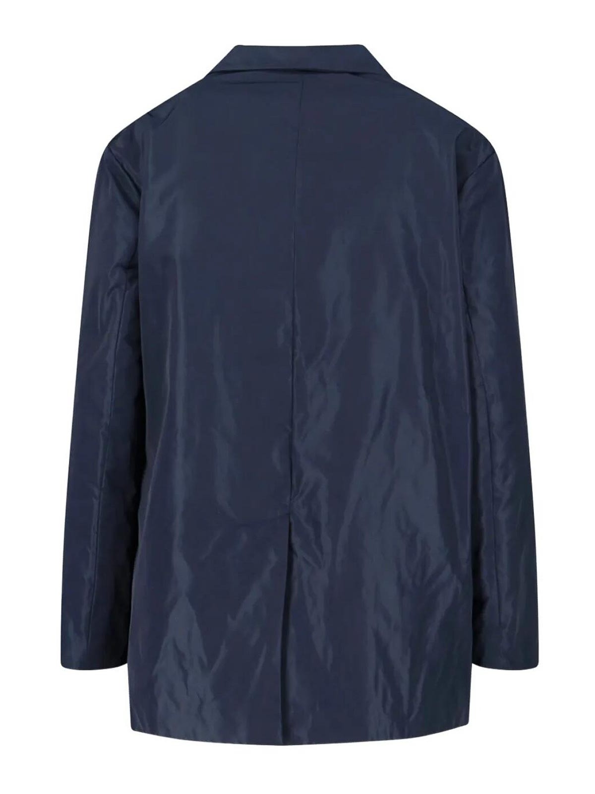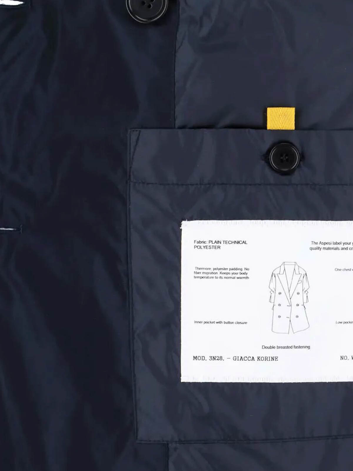 テクニカルナイロンのダブルブレストジャケット。濃いネイビーブルーにブラックのディテールが施されています。ポインテッドラペル、ボタン留め、外ポケット4つ (フラップ付きポケットが2つ、胸に1つ、後ろに1つ) が特徴のスタイルです。レギュラーフィット、ストラクチャードショルダー、ヒップレングス。内側は裏地付きで快適性を高めています。ワードローブに洗練されながら現代的な雰囲気を加えるのに理想的です。