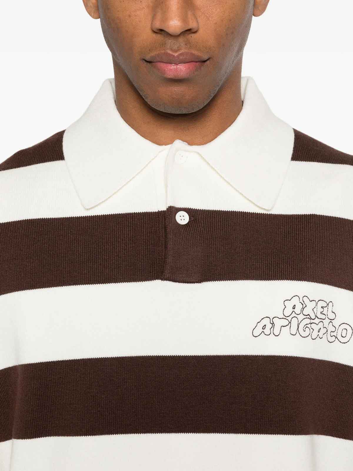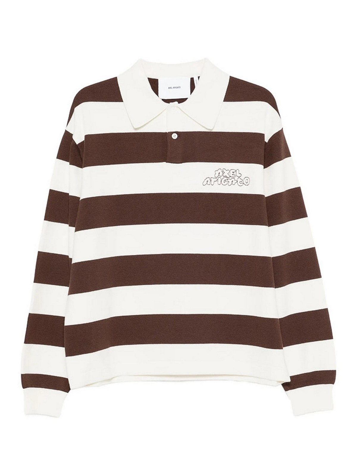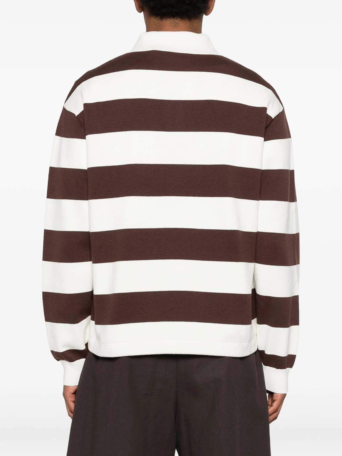 フロントにブラウンストライプデザインロゴ入りポロ襟長袖ボタン留め