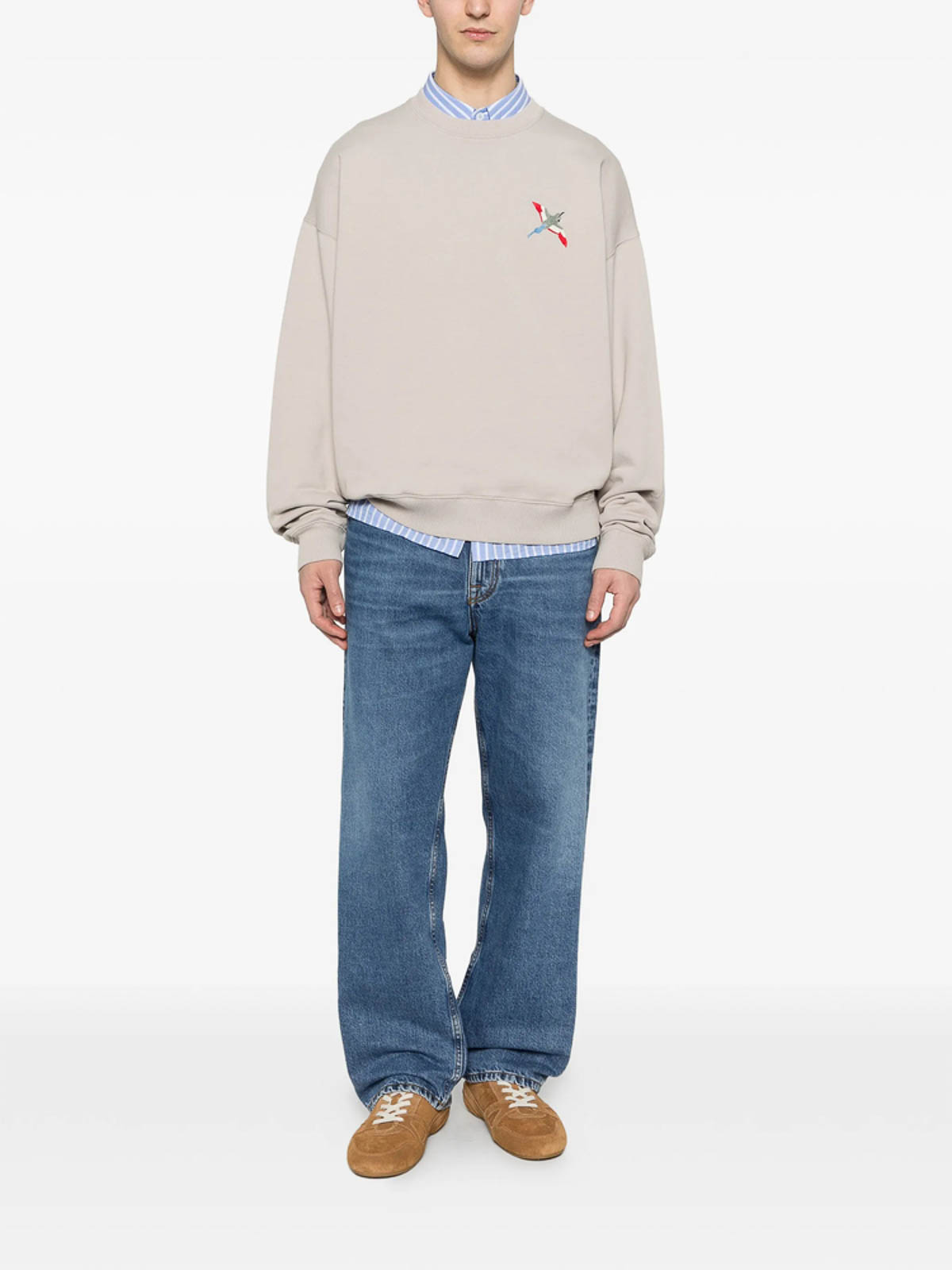 ベージュクルーネック長袖刺繍ディテールリブ編みカフスリブ編みの裾