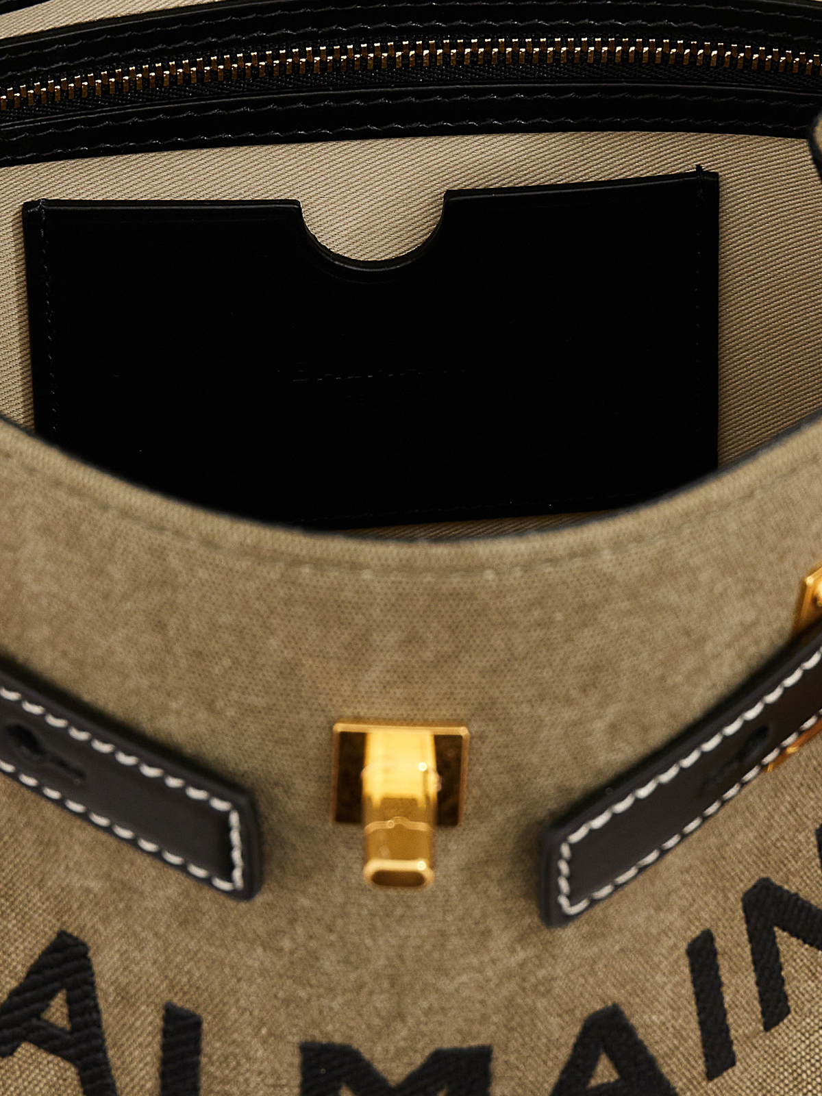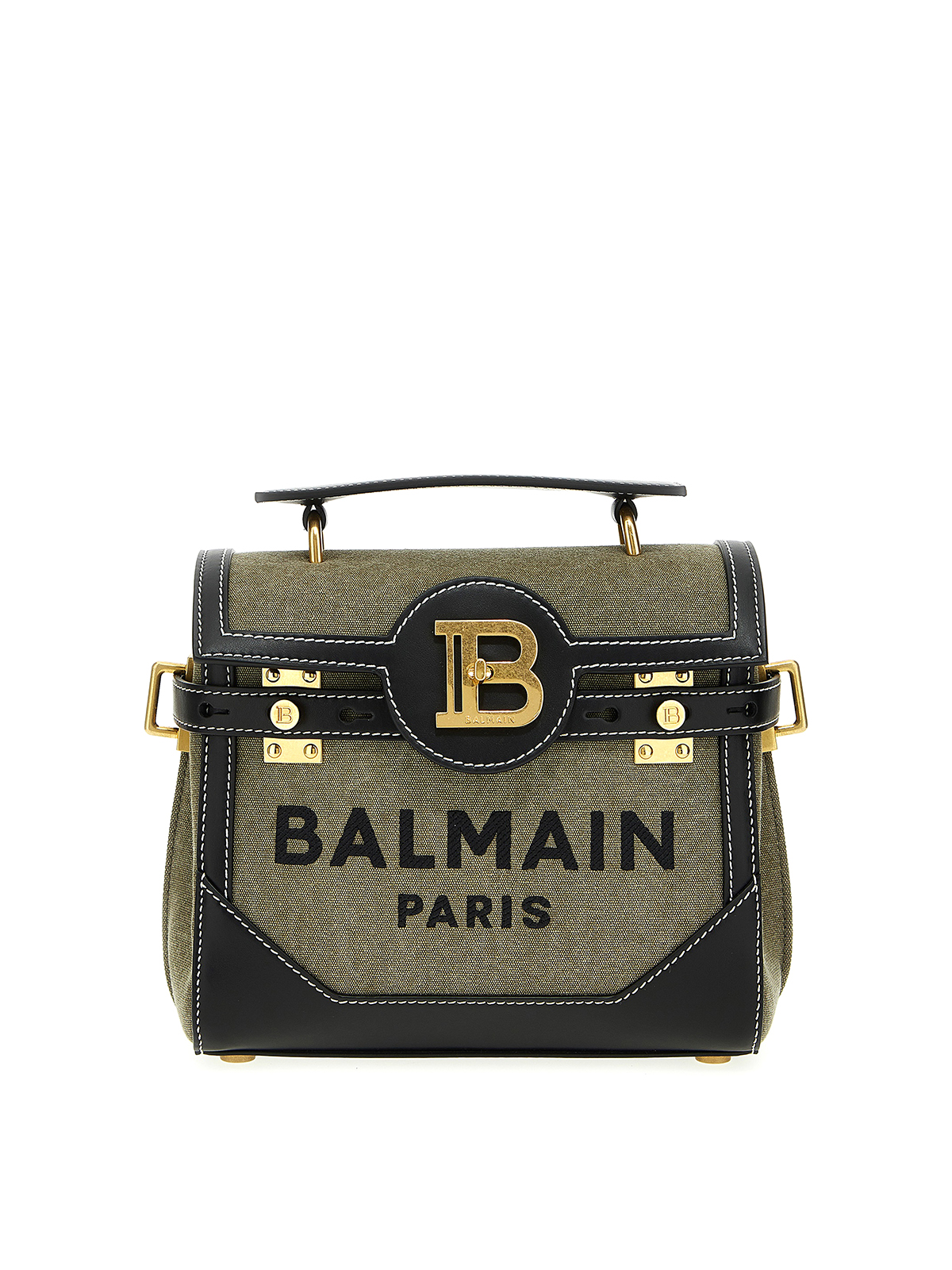 レザーとキャンバス生地のB-buzzクロスボディバッグ。Bロゴフラップとターンロッククロージャー。固定式レザーハンドル、調節可能で取り外し可能なショルダーストラップ、ゴールドメタルのディテール付き。