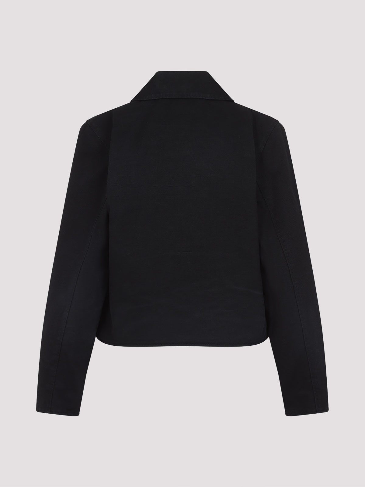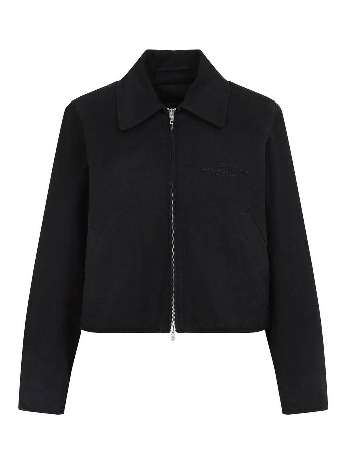 バレンシアガブラックコットンシュリンクパーカー。ピュアブラックコットンパーカー、ポインテッドカラー、フロントファスナー、サイドポケット、ロングスリーブ、ストレートヘム、トーナルステッチ。