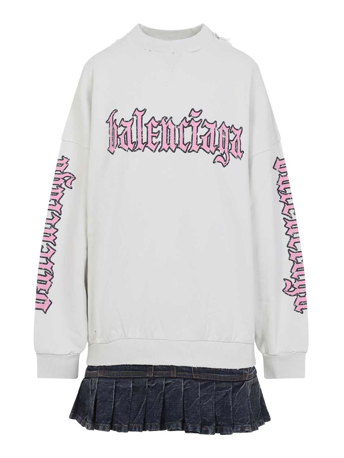 Balenciaga ハイブリッドホワイトミニドレス。ダーティーホワイトのディストレスト加工を施したデザインで、胸元と袖と背面にロゴが刻印されています。ラウンドネックライン、ドロップショルダー、リブ編みの袖口が付いたロングスリーブ、ブラックデニムのプリーツスカート。