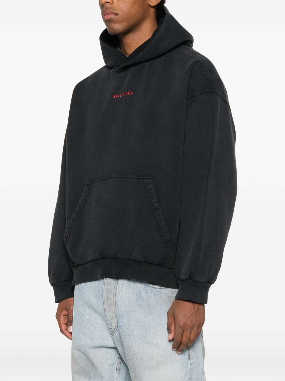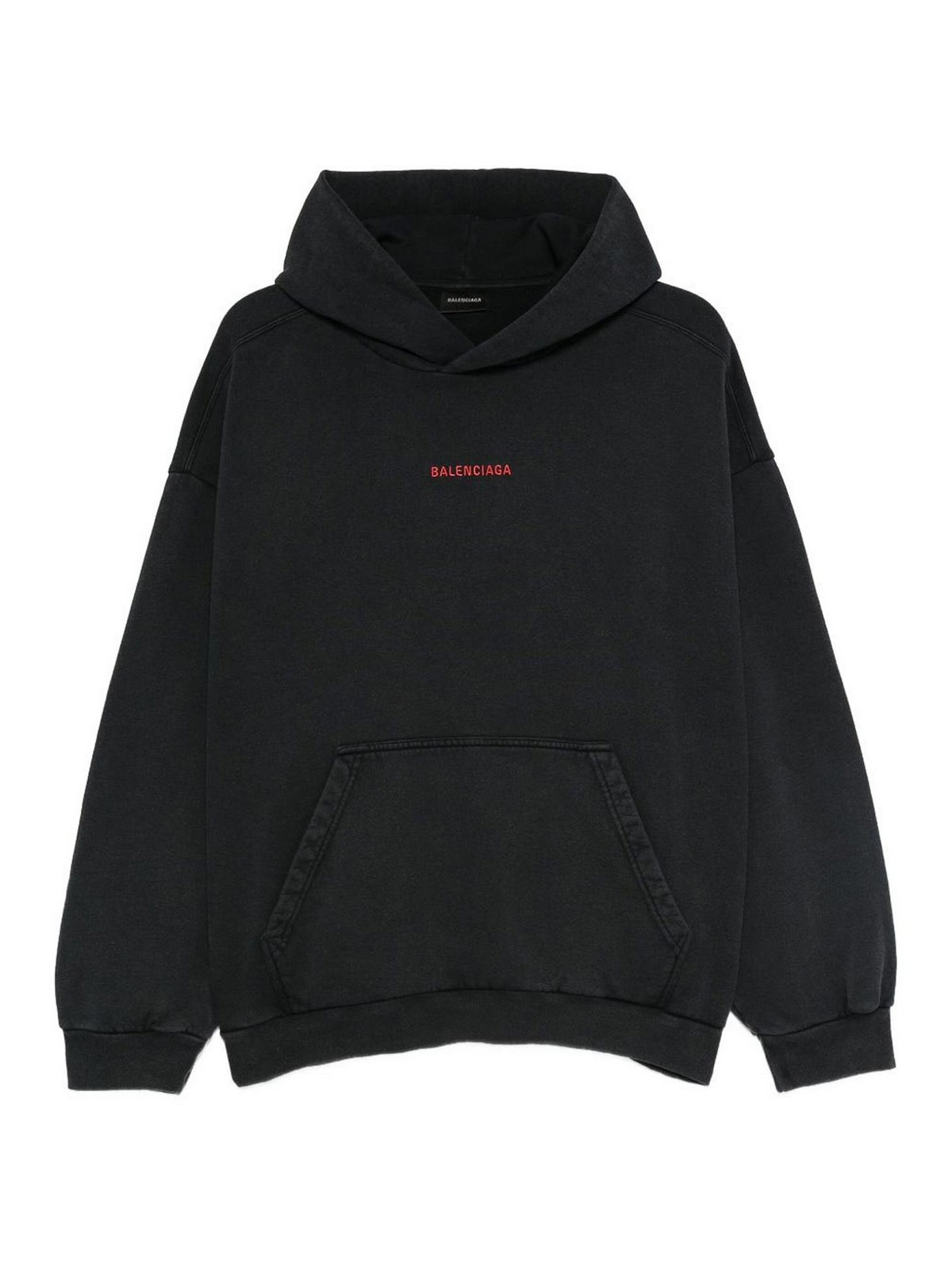 ドライフリース、ドローストリングなしのフード、ドロップショルダー、フロントにカンガルーポケット1つ、袖口とウエストラインにギャザー付き、前面と背面にバレンシアガのバックアートワーク刺繍