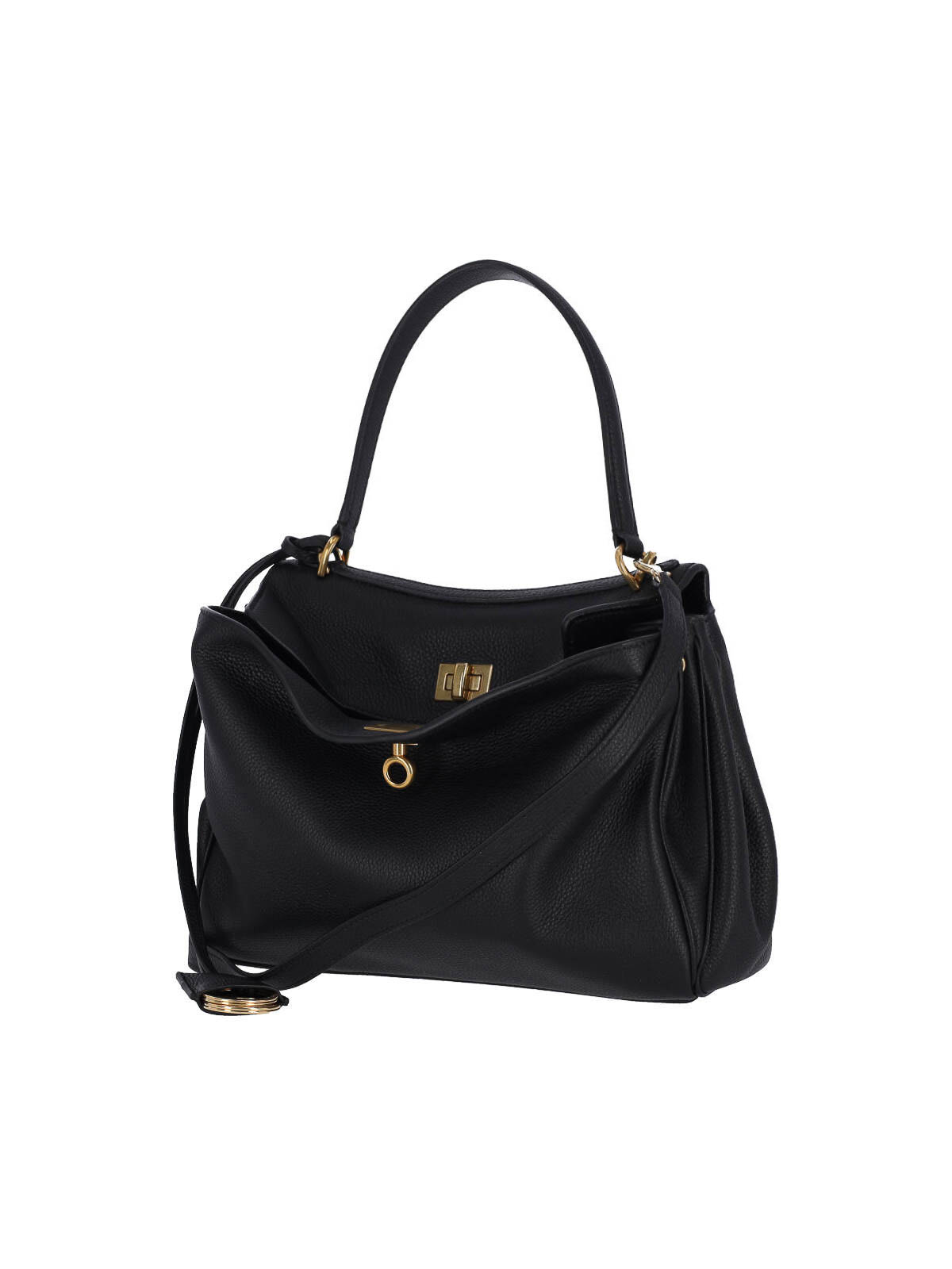 Balenciaga ブラックレザー製スモールロデオバッグ、トップハンドル、ゴールドメタルのダブルリング付き取り外し可能なレザーキーリング、取り外し可能なショルダーストラップ、ツイストフラップクロージャー、サイドプレスボタンで調節可能、フラットバックポケット2つ、内側にファスナーポケット1つ、独立した内部コンパートメント2つ、底にゴールドのメタルフィート。