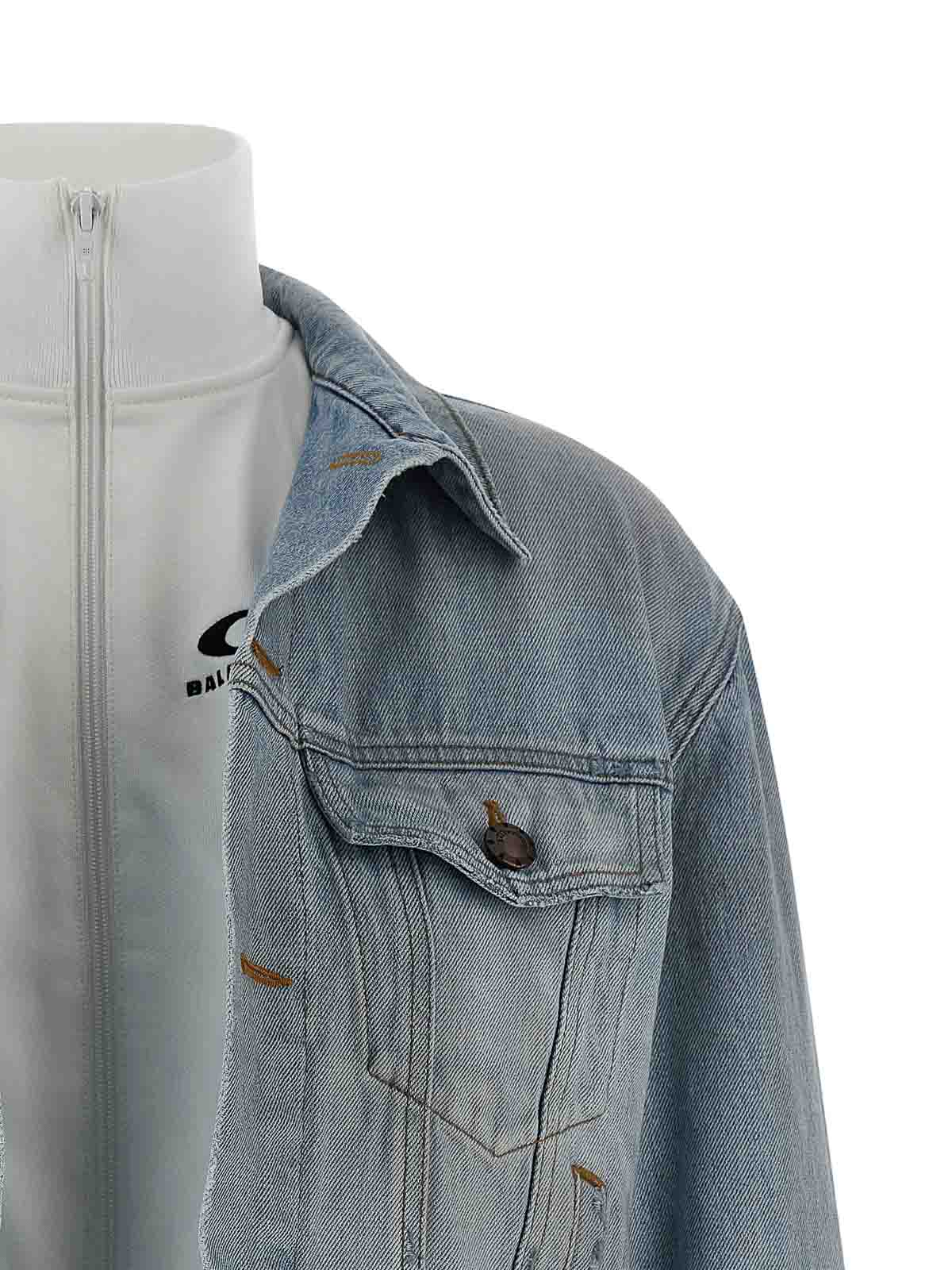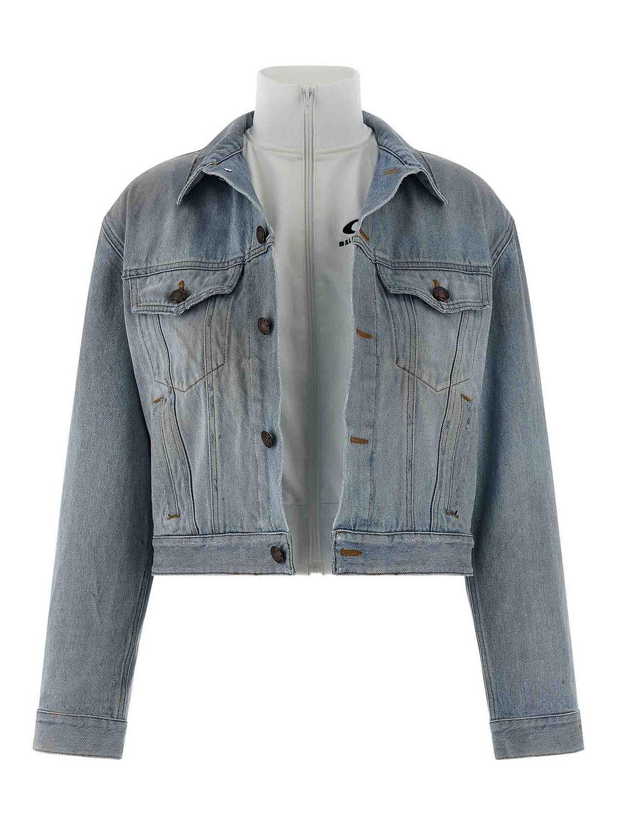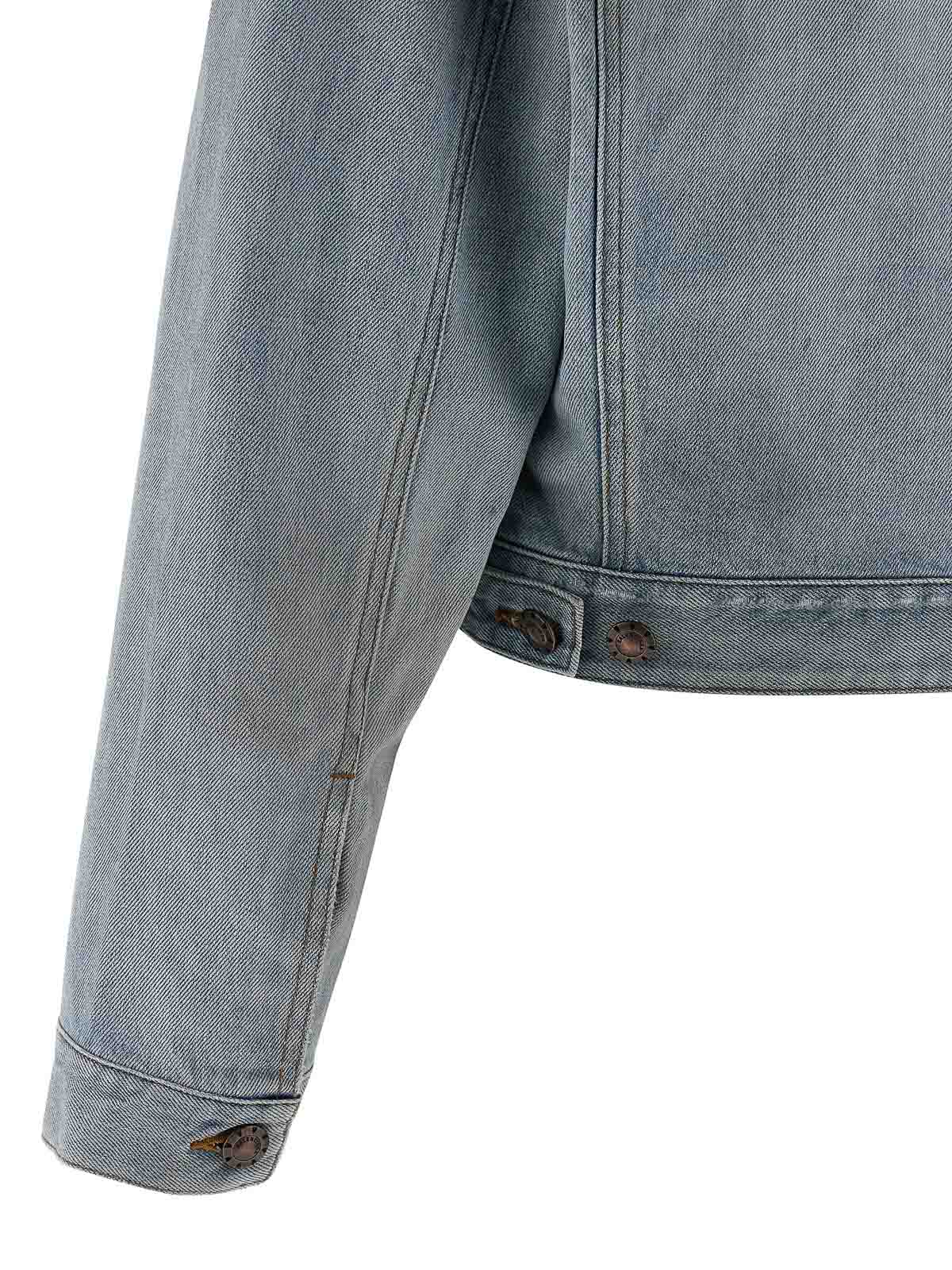 ストーンウォッシュ加工のコットンデニムジャケット。ステンド&ユーズド加工を施したデザイン。クロップモデル。ハイネックのビブとコットンのファスナー開閉のダブルレイヤーディテール、コントラストステッチ、シャツカラー、フロントボタン留め、ポケット、ロングカフスリーブ、コットン裏地。
