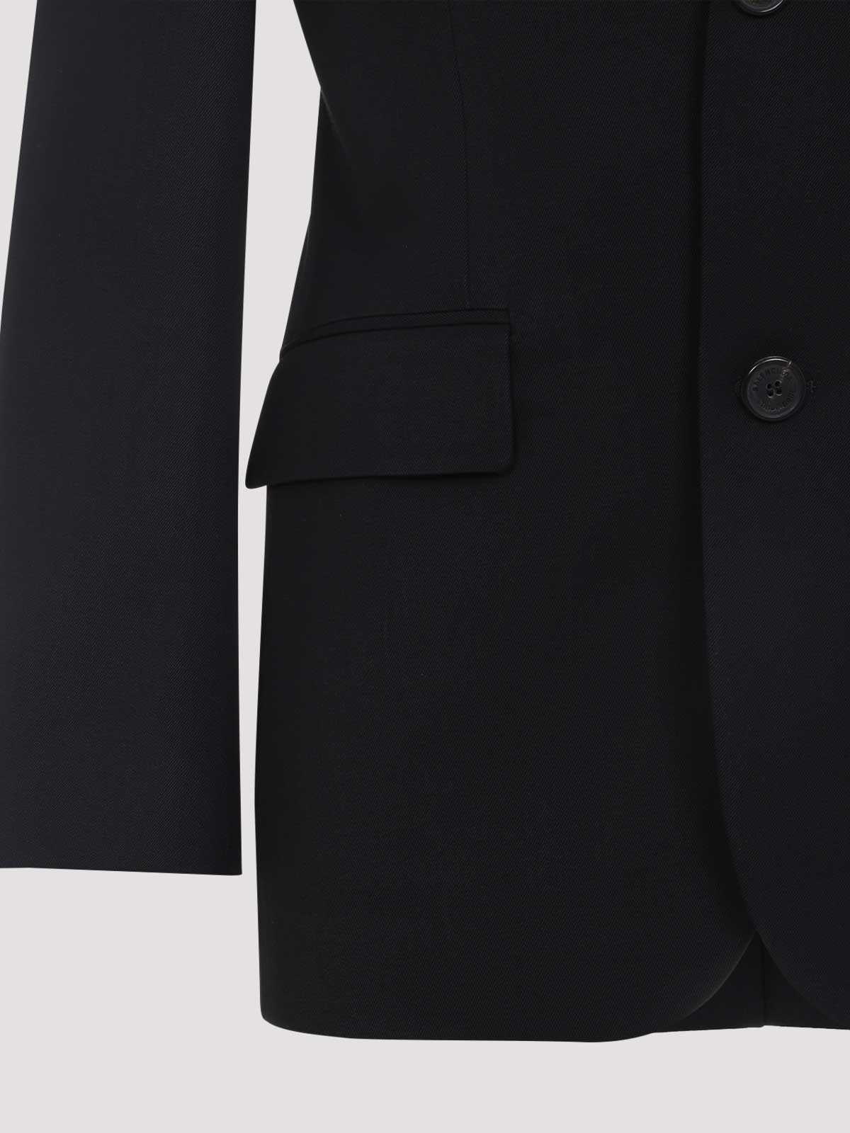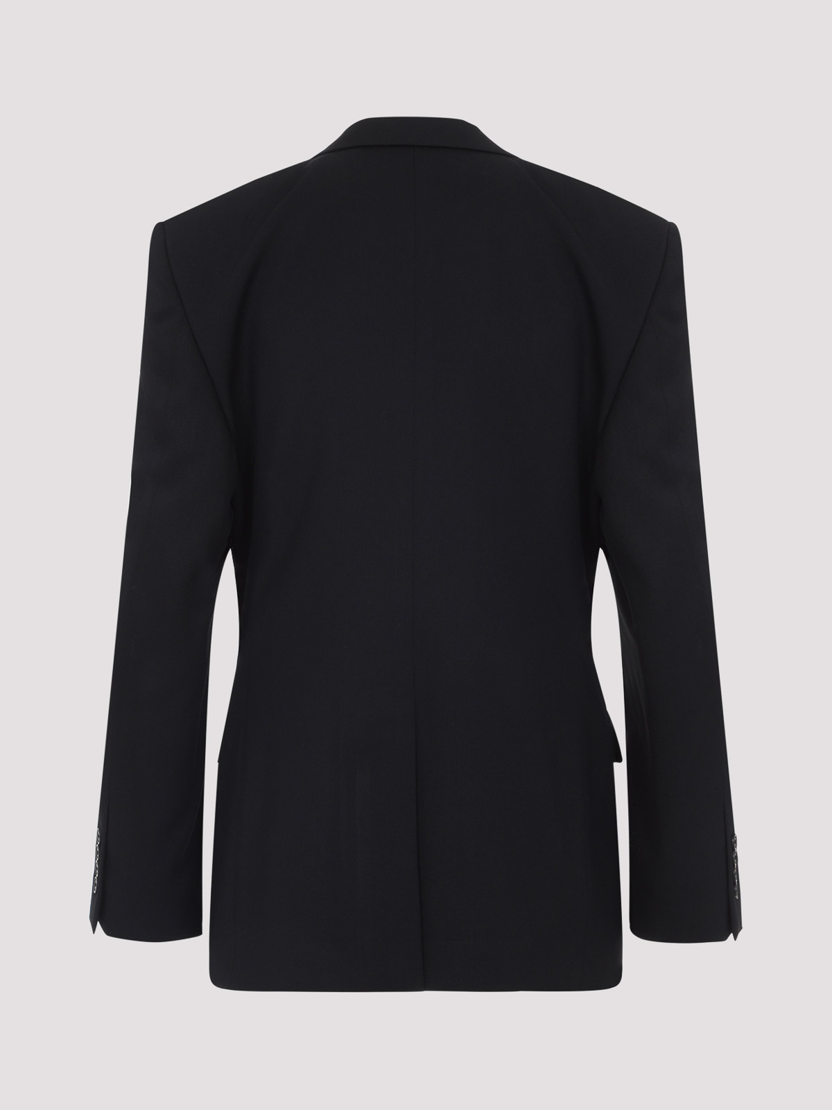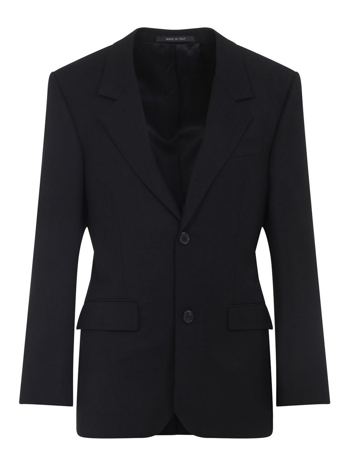Balenciaga ブラックコットンテーラードジャケット。ブラックコットン、ノッチカラー、ロングスリーブ、フロントボタン留め、胸ポケット、フロントフラップポケット、ビスコース裏地。レギュラーフィット。