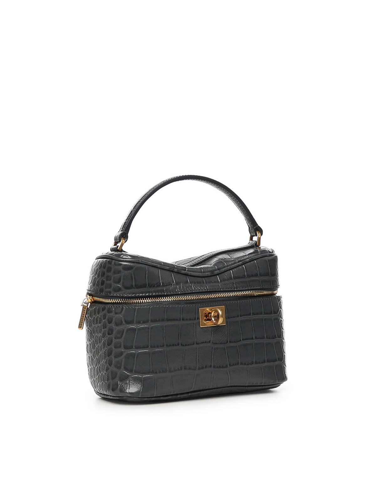 クロコダイルのエンボス加工が施されたカーフスキン製、ジッパー開閉、調節可能で取り外し可能なショルダーストラップ、ロゴのディテール、取り外し可能なショルダーストラップ、イタリア製、寸法:18 x 12.9 x 8.3 cm、デザイナーカラー:ボルカニックロック