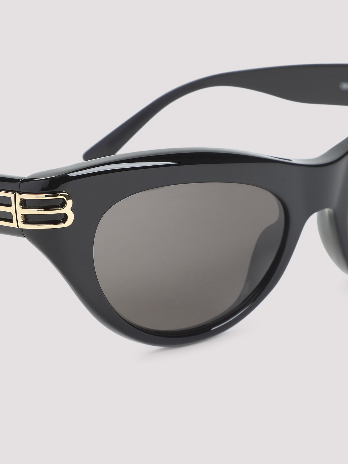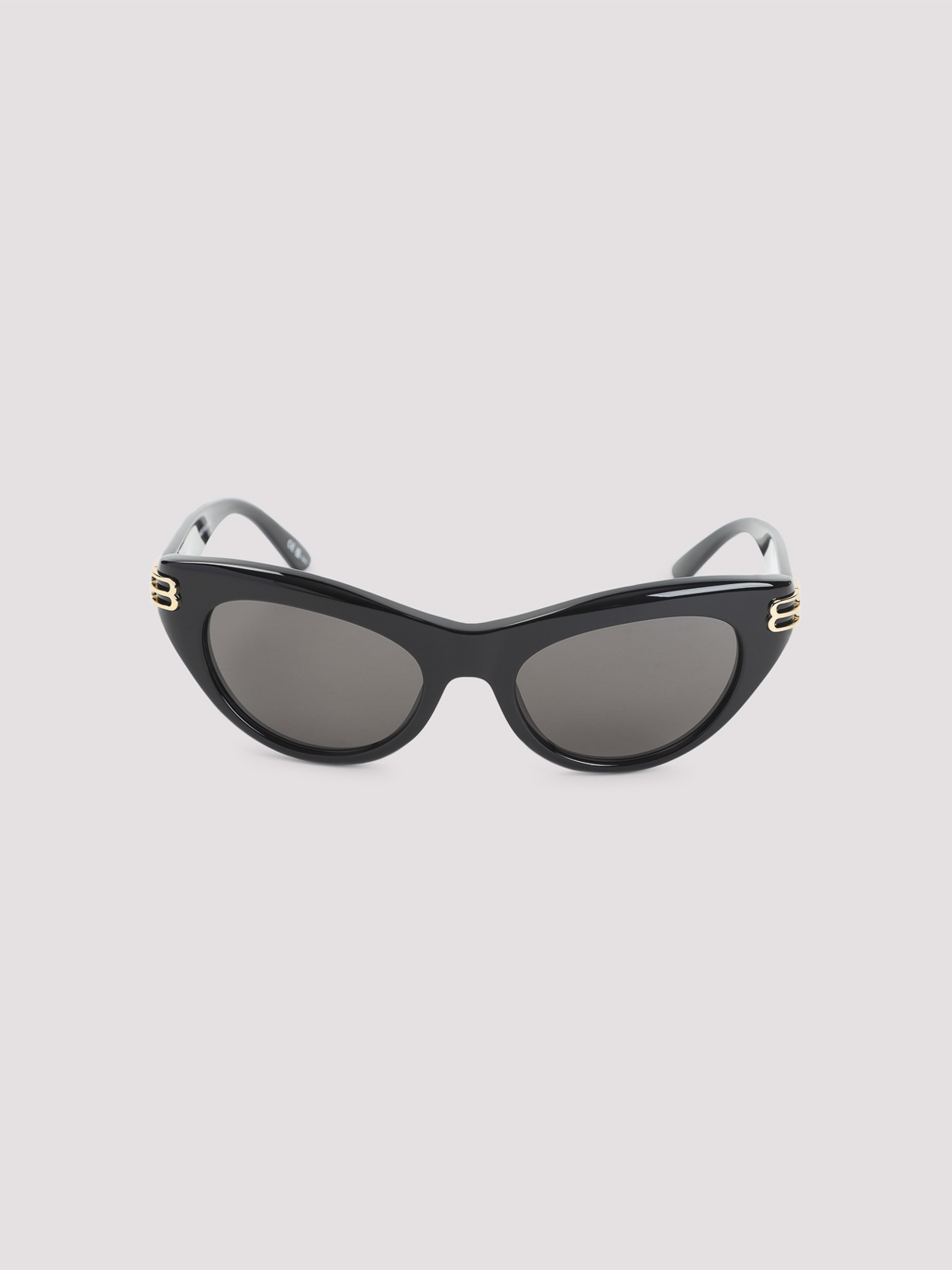 バレンシアガブラックカジノBTFサングラス。ブラックアセテートフレーム、キャットアイシルエット、シグネチャーゴールドロゴのディテールが施された同系色のテンプル。同系色レンズ、100% UVB保護。