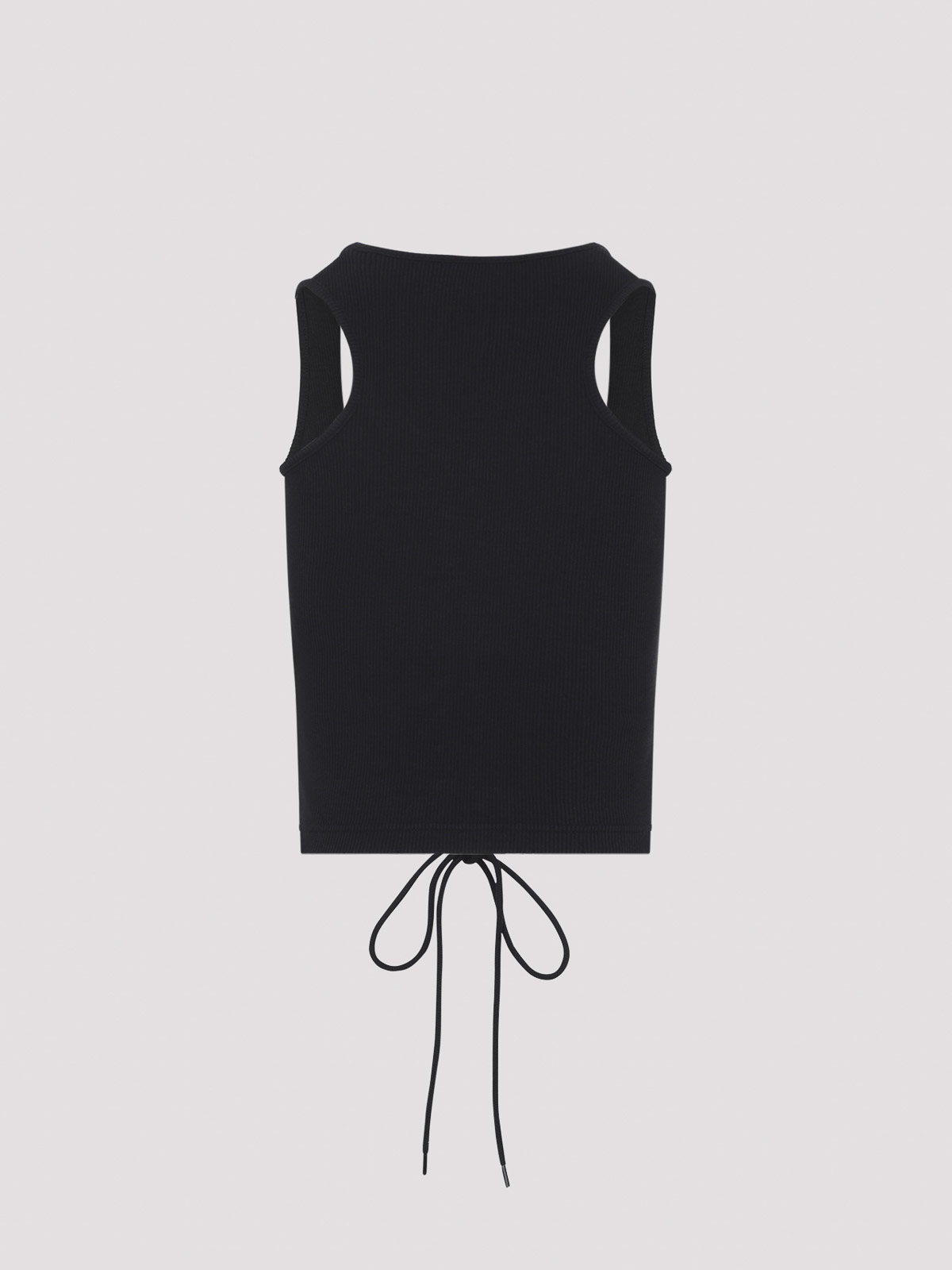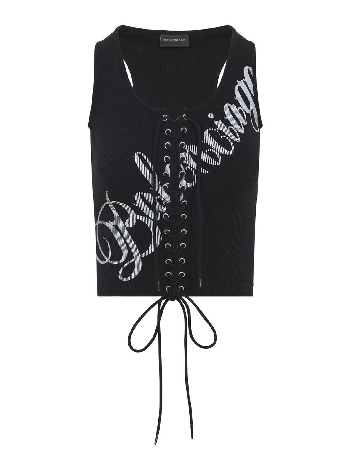 バレンシアガブラックコットンレースアップトップ。ピュアブラックコットントップ、ラウンドトウ、フロントコントラストの効いたホワイトレタリングロゴ、フロントスリット、フロントの色調調節可能な十字ストラップ、ノースリーブ、ストレートヘム、全面リブ編み。